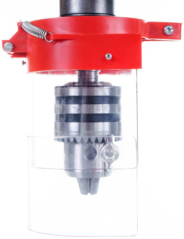 Przezroczysta osłona chroni operatora przed odpryskami materiału i chłodziwa. Zabezpieczenie uniemożliwia uruchomienie maszyny przy otwartej osłonie, co ogranicza ryzyko kontaktu z obracającym się wrzecionem i wiertłem podczas pracy.