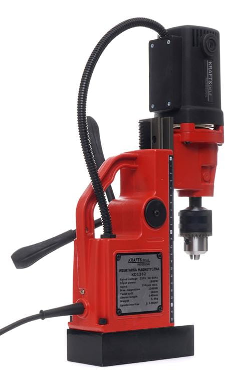 KD1382 to przenośna wiertarka z elektromagnetyczną podstawą przeznaczona do wiercenia, pogłębiania i rozwiercania w elementach stalowych i żeliwnych. Elektromagnes o sile przyczepności 1300 N stabilizuje urządzenie na obrabianej powierzchni bez konieczności stosowania dodatkowych mocowań, co umożliwia pracę w każdej orientacji — poziomej, pionowej i pod kątem.
