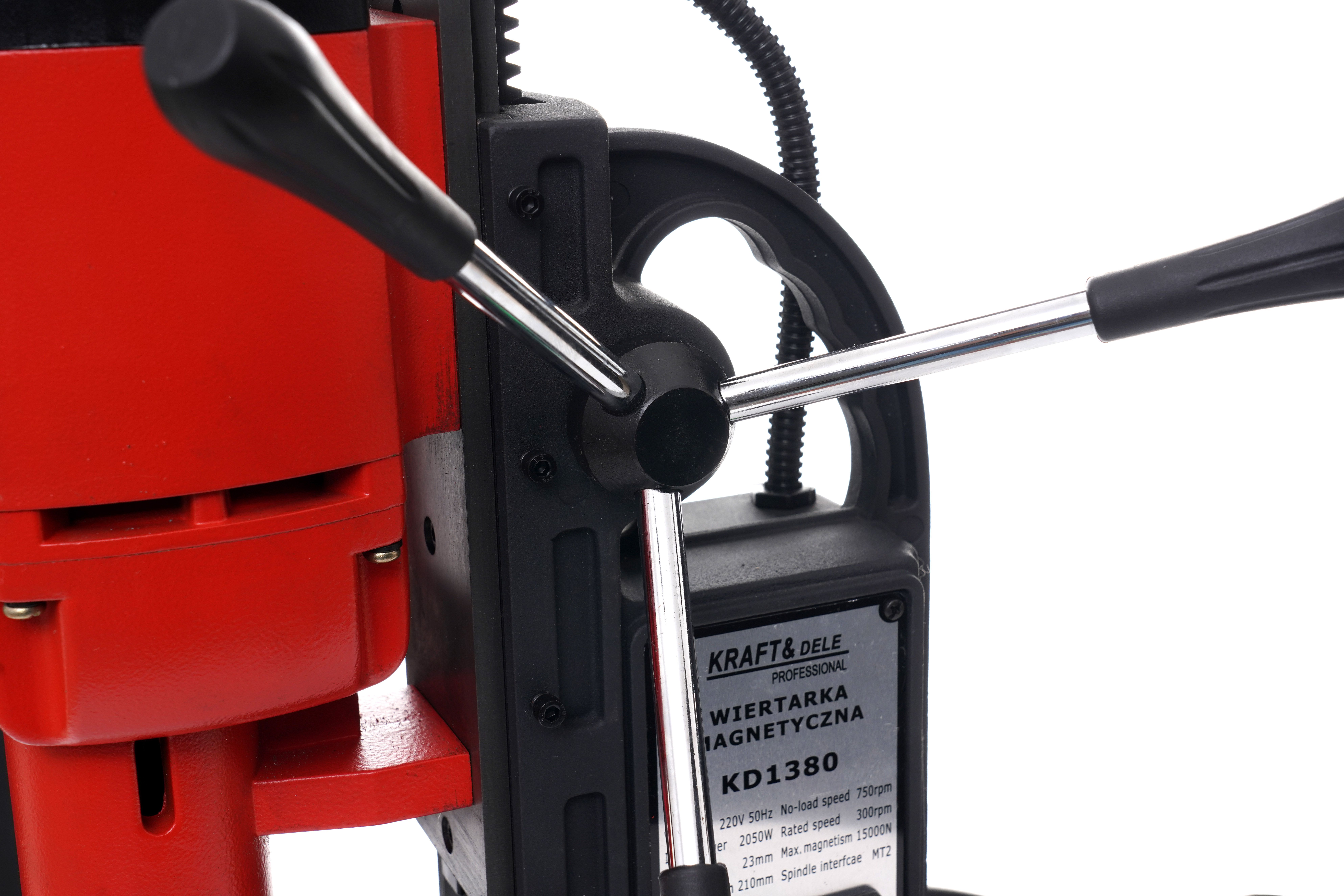 Uchwyt oraz 3 wydłużone korby ułatwiają przenoszenie i przemieszczanie wiertarki magnetycznej Kraft&Dele KD1380 oraz wygodne prowadzenie podczas pracy.