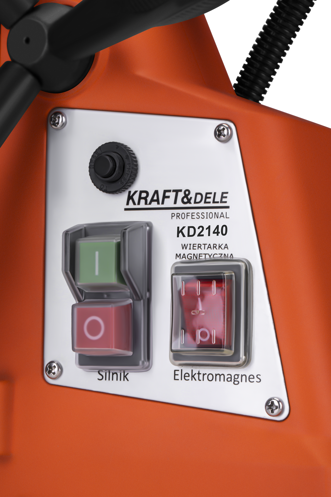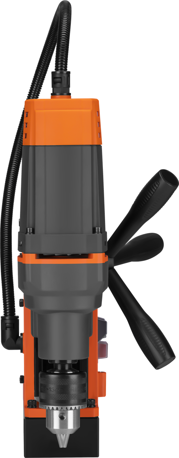 Siła przyciągania 14 000N (ok. 1430 kgf) zapewnia pewne unieruchomienie wiertarki na powierzchni stalowej podczas wiercenia. Oddzielny włącznik elektromagnesu umożliwia aktywację podstawy przed uruchomieniem silnika — co jest istotne z punktu widzenia bezpieczeństwa pracy.