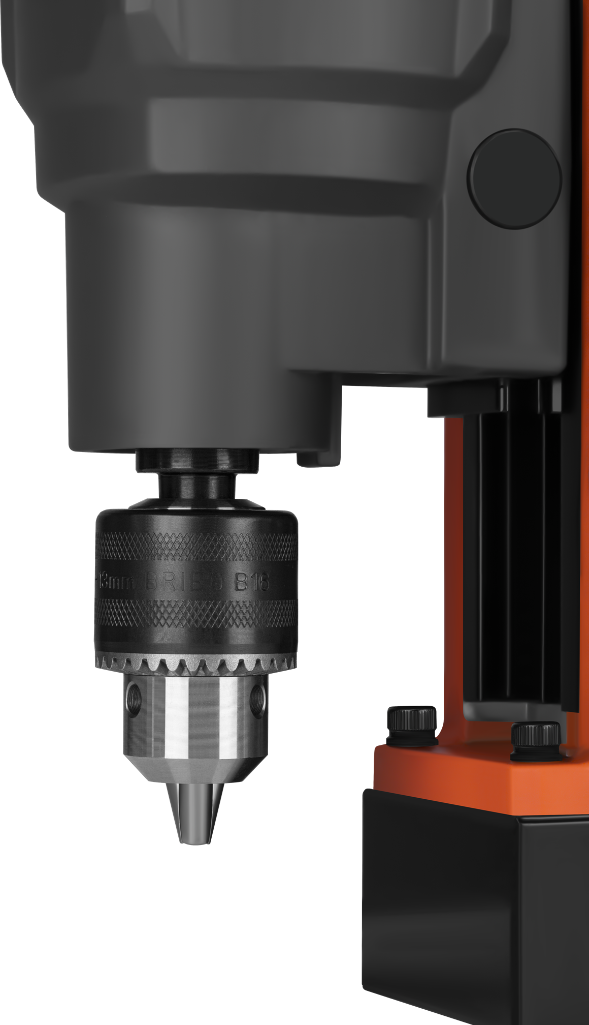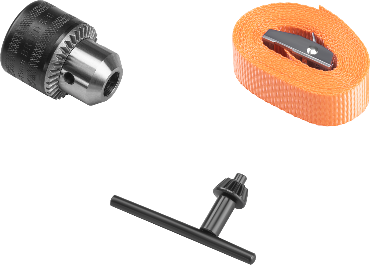 Ergonomiczne, trzyramienne pokrętło prowadzące zapewnia równomierny nacisk na wiertło i precyzyjną kontrolę posuwu. Uchwyt wiertarski zaciskany kluczykiem pewnie utrzymuje wiertło w osi, co ma bezpośredni wpływ na dokładność i powtarzalność wykonywanych otworów.