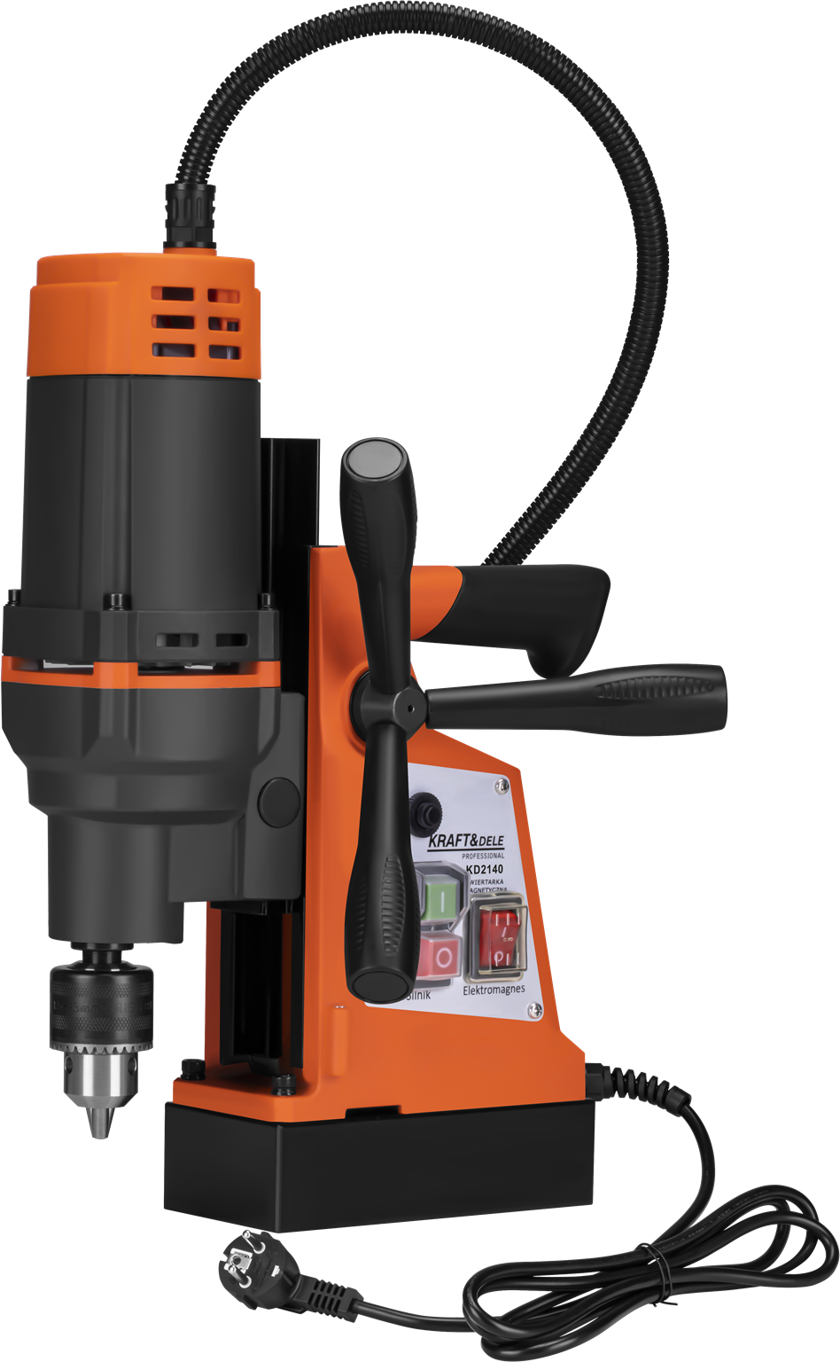 KD2140 to wiertarka magnetyczna (magdrill) zasilana sieciowo (230V), przeznaczona do precyzyjnego wiercenia otworów w elementach stalowych i innych materiałach metalowych. Elektromagnes mocuje urządzenie bezpośrednio do obrabianego materiału, eliminując potrzebę stosowania dodatkowych uchwytów lub imadeł — co jest kluczową zaletą podczas pracy na konstrukcjach stalowych in situ.