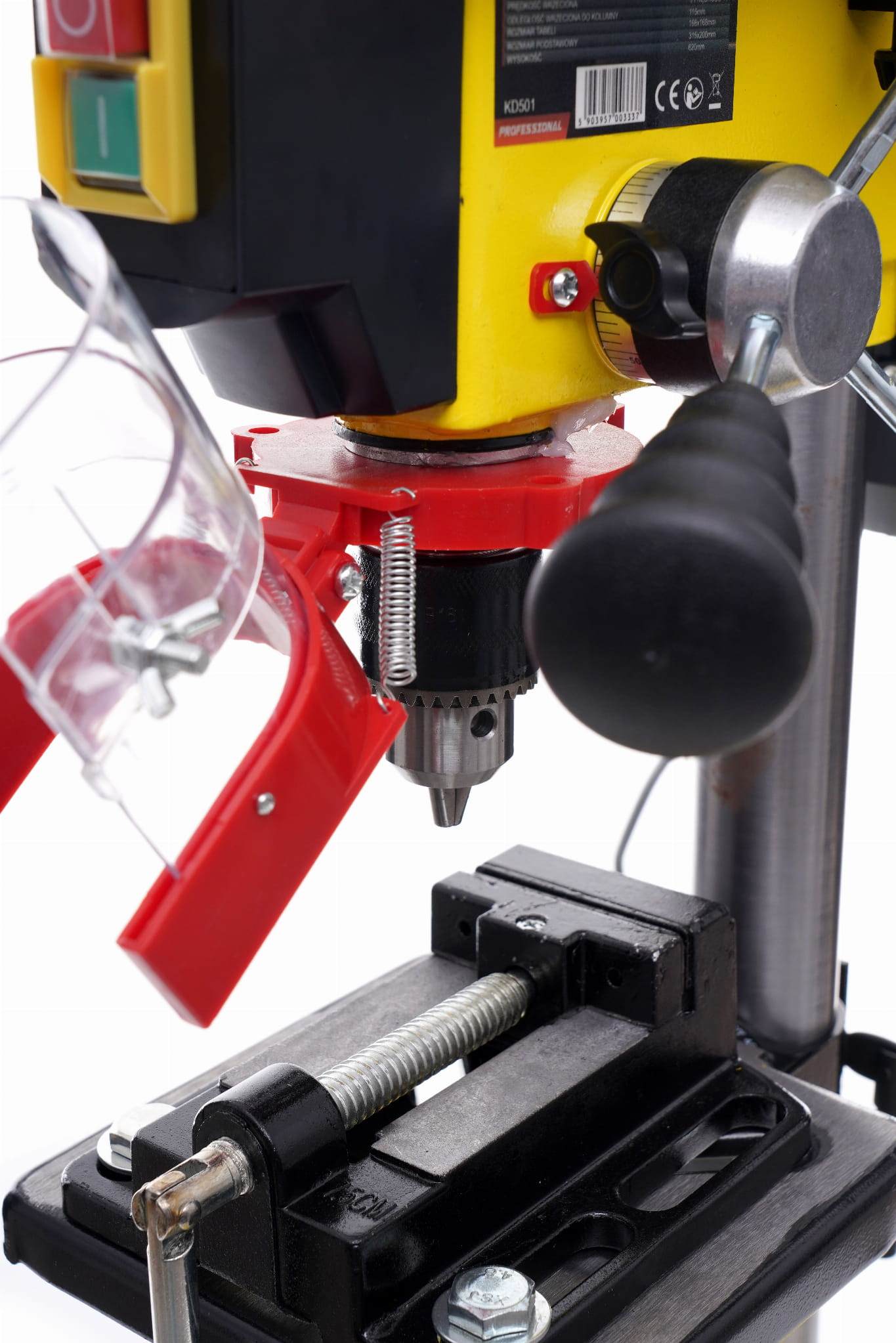 Trójszczękowy uchwyt wiertarski o maksymalnej średnicy 13 mm przyjmuje standardowe wiertła cylindryczne. Mocowanie na stożku Morse'a B16 zapewnia pewne osadzenie i eliminuje bicie wrzeciona podczas pracy. Do wymiany uchwytu służy dołączony klucz.