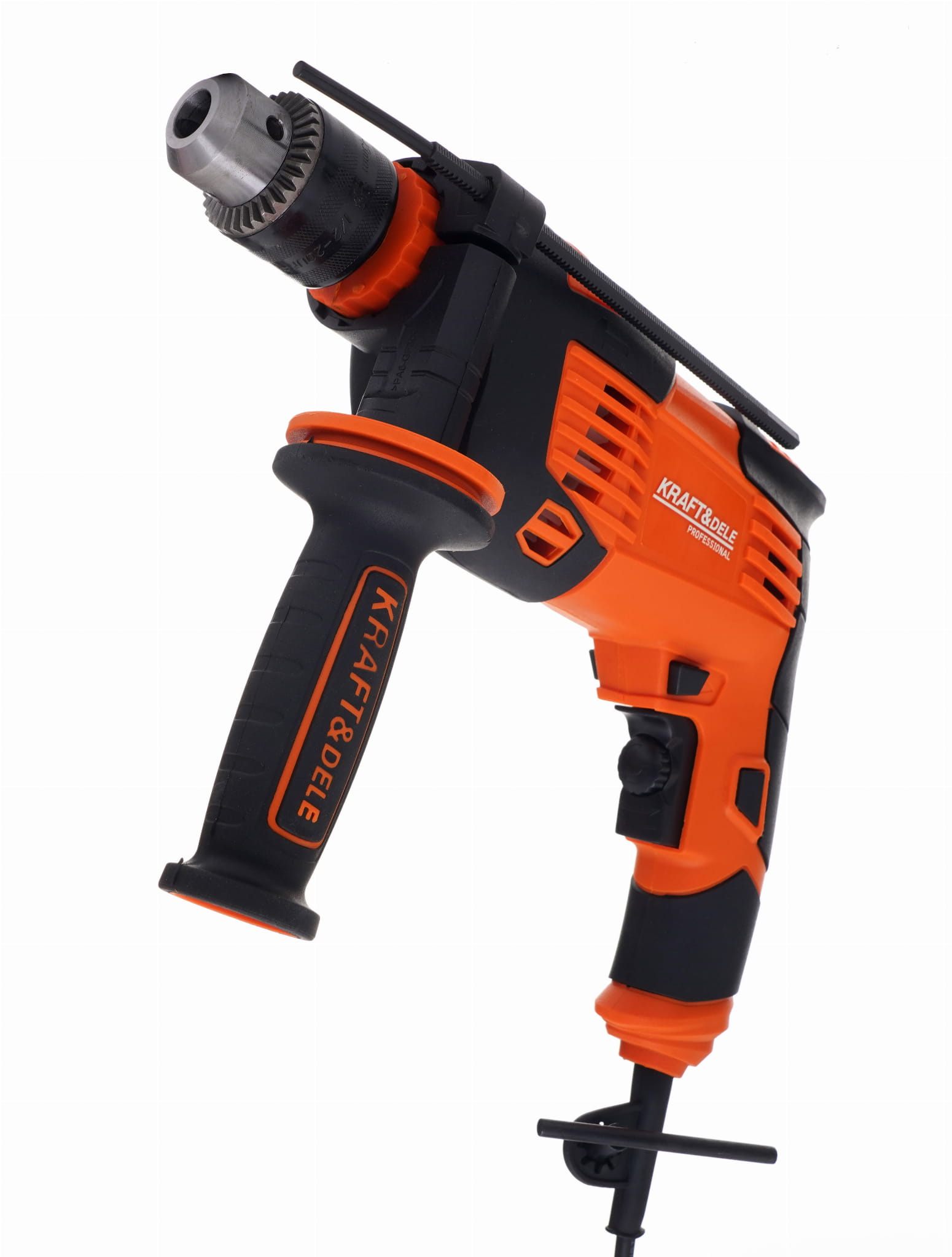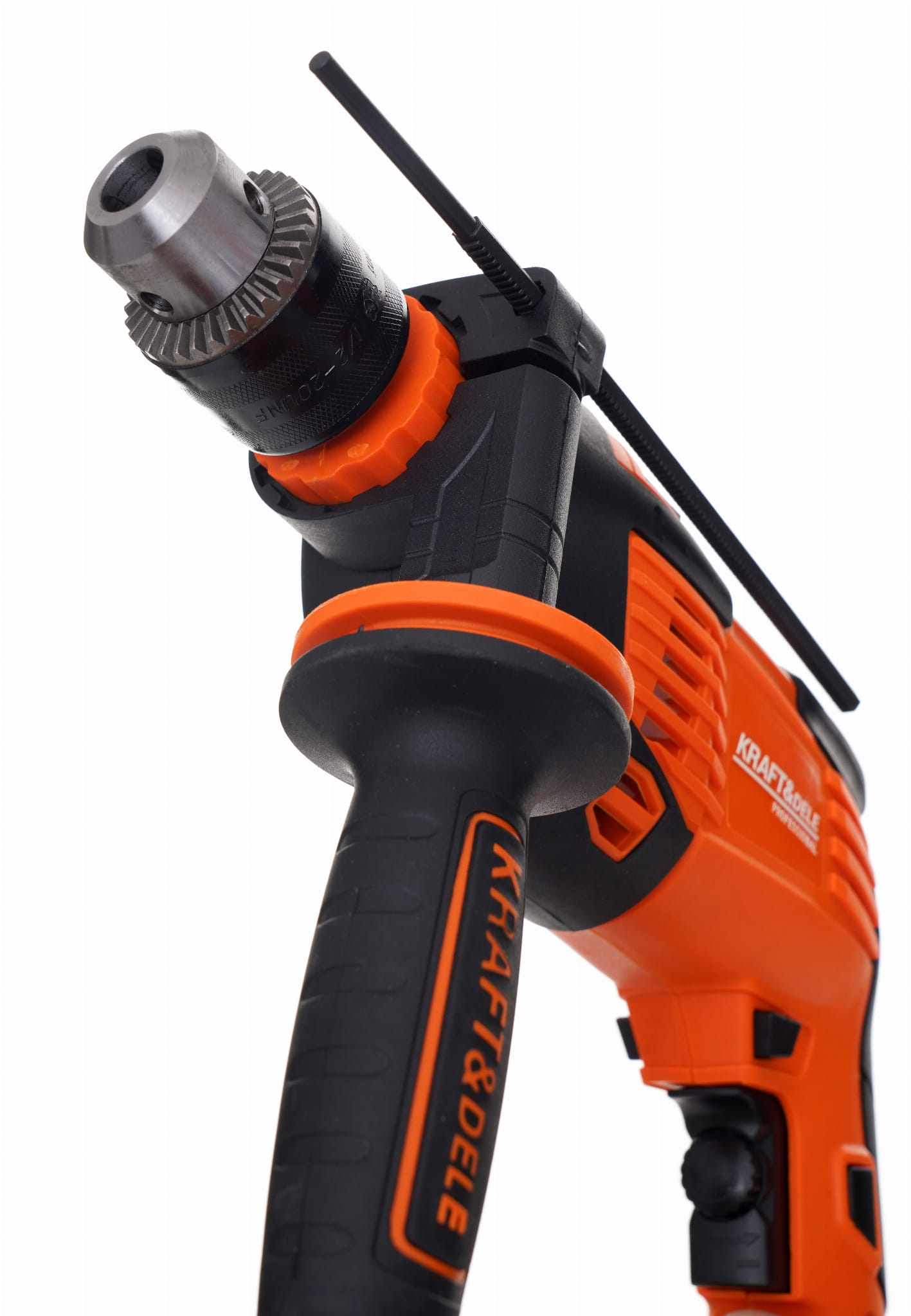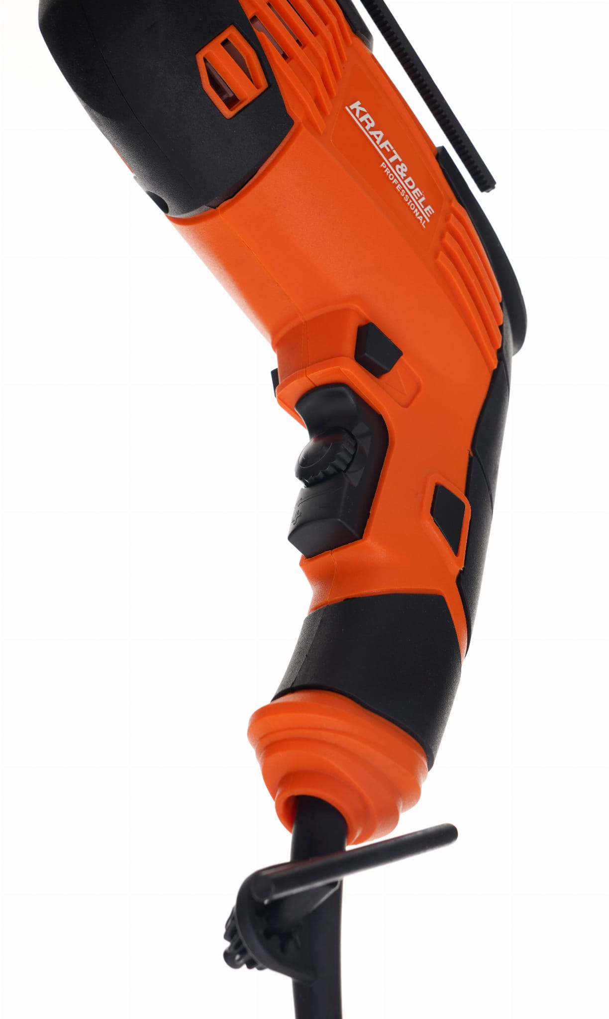 Boczna rękojeść umożliwia oburęczne trzymanie wiertarki, co zwiększa stabilność prowadzenia narzędzia — szczególnie przy wierceniu w betonie, gdzie opór materiału jest znaczny. Uchwyt boczny jest standardem w wiertarkach udarowych przeznaczonych do prac budowlanych.