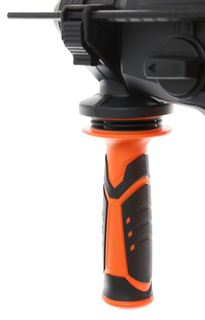 Główna rękojeść pokryta materiałem antypoślizgowym poprawia pewność chwytu podczas pracy, szczególnie przy długotrwałym użytkowaniu lub w warunkach zapylenia. Dodatkowy uchwyt boczny zwiększa kontrolę nad narzędziem przy wierceniu z dużym oporem.