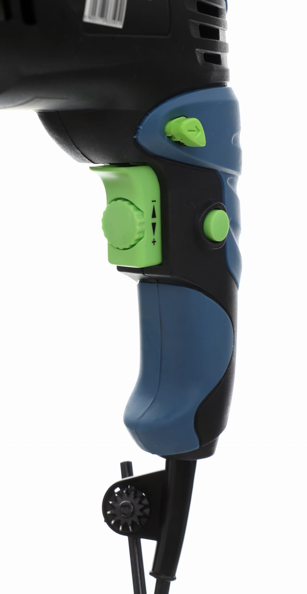 Elektroniczna regulacja prędkości obrotowej umożliwia dopasowanie parametrów pracy do materiału i średnicy wiertła — mniejsze obroty przy wierceniu w metalu ograniczają przegrzewanie, wyższe przyspieszają pracę w drewnie. Funkcja rewersu (obroty lewo/prawo) ułatwia wyciąganie zakleszczonego wiertła oraz jest wymagana przy pracy z końcówkami do wkrętów.