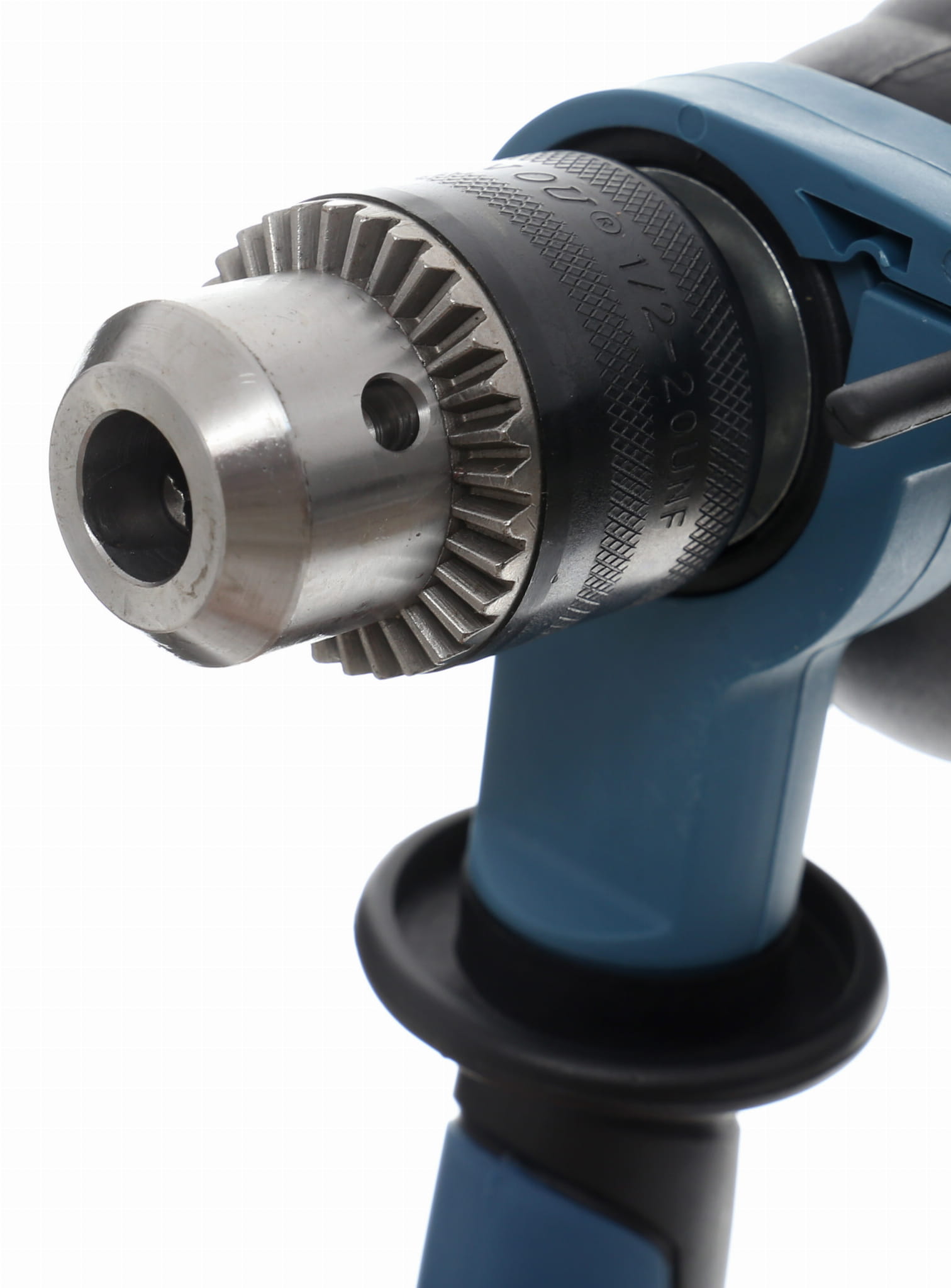 Główna rękojeść wykonana z antypoślizgowego materiału zapewnia stabilny chwyt nawet przy wilgotnych dłoniach. Dodatkowa rękojeść boczna umożliwia oburęczne trzymanie urządzenia, co jest istotne przy wierceniu z większym dociskiem — zwiększa kontrolę nad kierunkiem wiercenia i redukuje zmęczenie podczas dłuższej pracy.