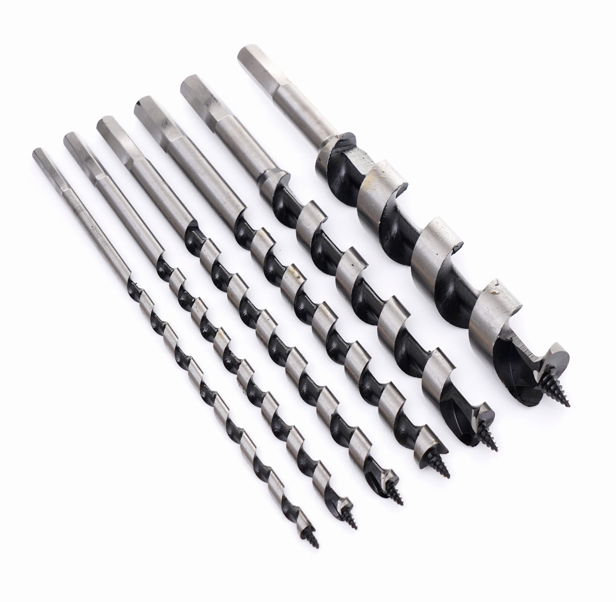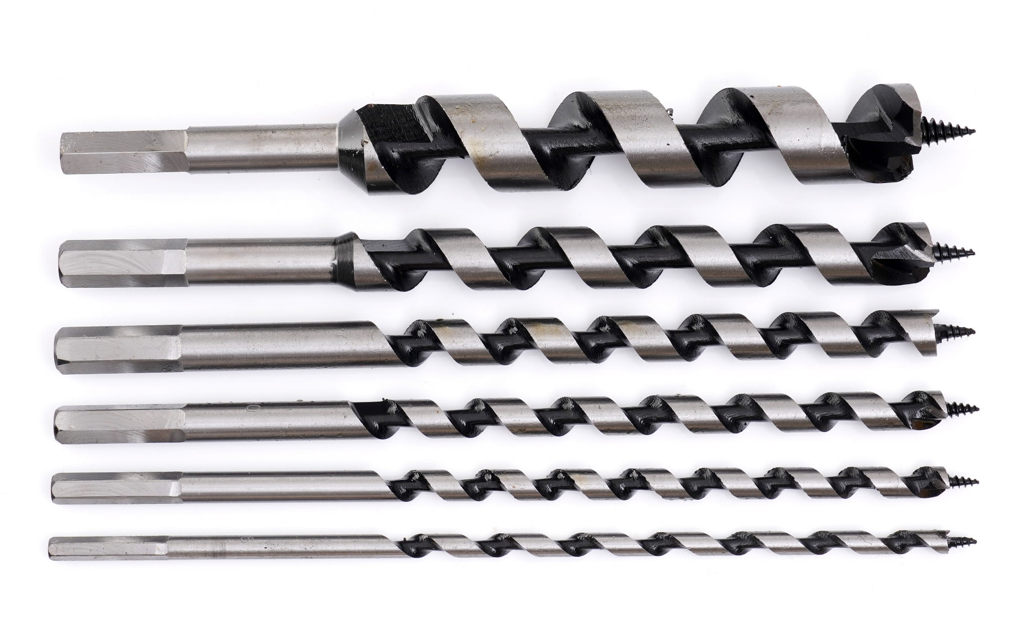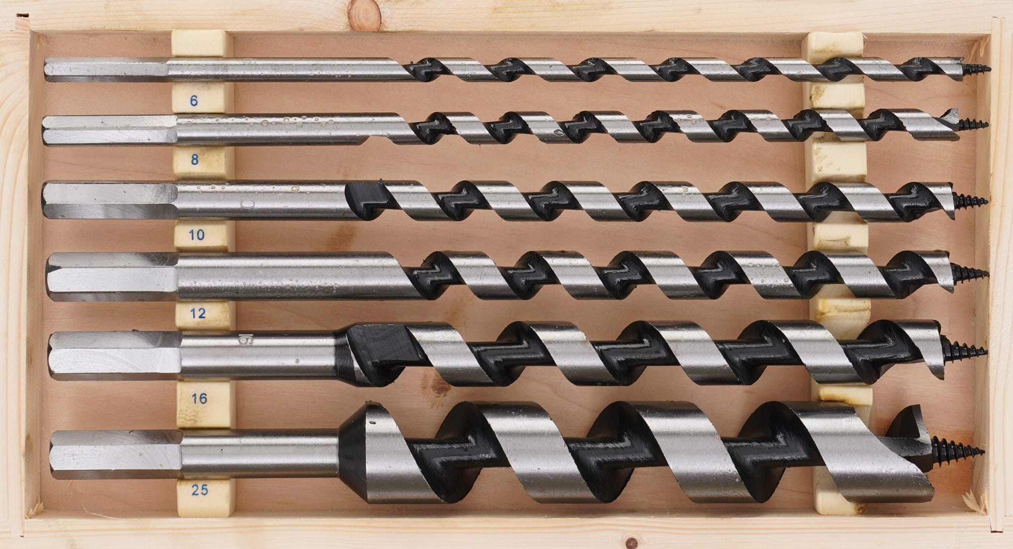 Zestaw sześciu wierteł spiralnych typu Lewis ze stali HSS, przeznaczonych do wiercenia w drewnie miękkim i twardym. Długość robocza 230 mm umożliwia wykonywanie głębokich otworów niedostępnych dla standardowych wierteł krętych. Zestaw zawiera wiertła w zakresie średnic od 6 do 25 mm i jest przechowywany w drewnianej walizce.