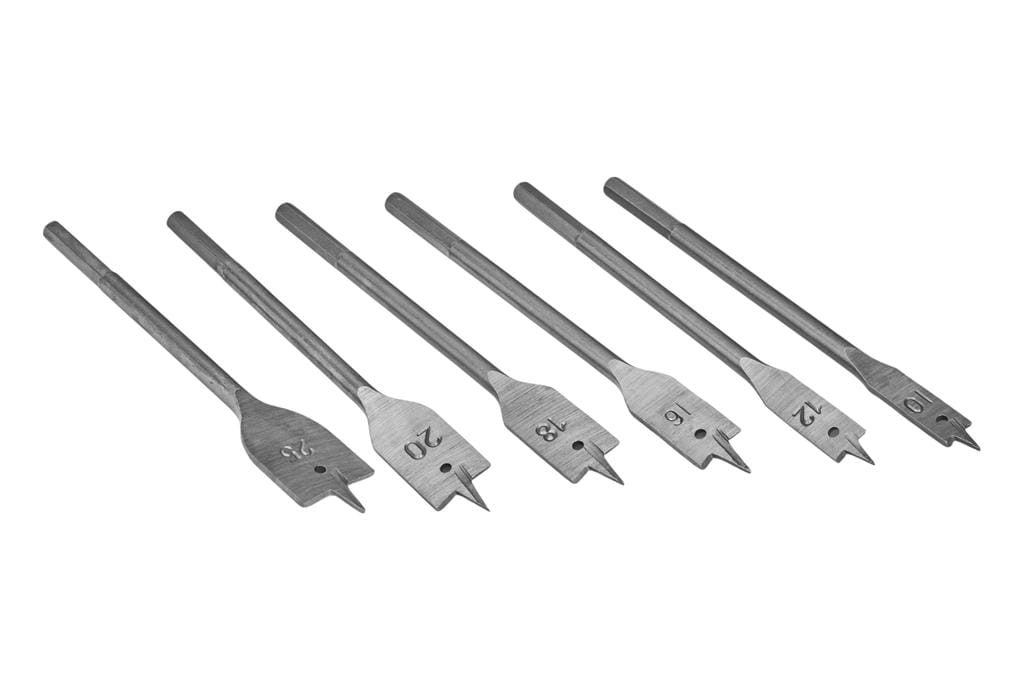 Zestaw sześciu wierteł łopatkowych KD10548 marki KraftDele przeznaczonych do wiercenia otworów przelotowych i nieprzelotowych w drewnie, płycie meblowej oraz tworzywach sztucznych. Wiertła wykonane ze stali węglowej obejmują zakres średnic od 10 do 25 mm, co pozwala na realizację większości typowych prac stolarskich i instalacyjnych bez konieczności dokupowania pojedynczych rozmiarów.