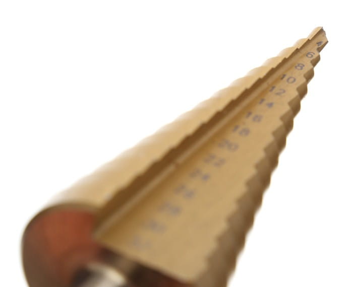 Zestaw trzech szlifowanych wierteł stopniowych wykonanych ze stali szybkotnącej (HSS) z powłoką azotku tytanu (TiN). Narzędzia przeznaczone do wiercenia otworów w cienkościennych blachach stalowych, metalach nieżelaznych oraz tworzywach sztucznych — bez konieczności wstępnego nawiercania i bez powstawania zadziorów.