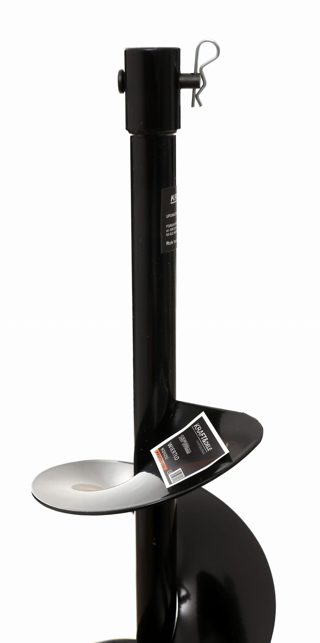 Wiertło spiralne marki Kraft&Dele o średnicy 150 mm i długości całkowitej 800 mm, przeznaczone do wiertnic spalinowych. Służy do wykonywania otworów w gruncie — przy montażu ogrodzeń, wiat, pergoli, słupów oświetleniowych oraz innych konstrukcji wymagających głębokiego kotwienia.
