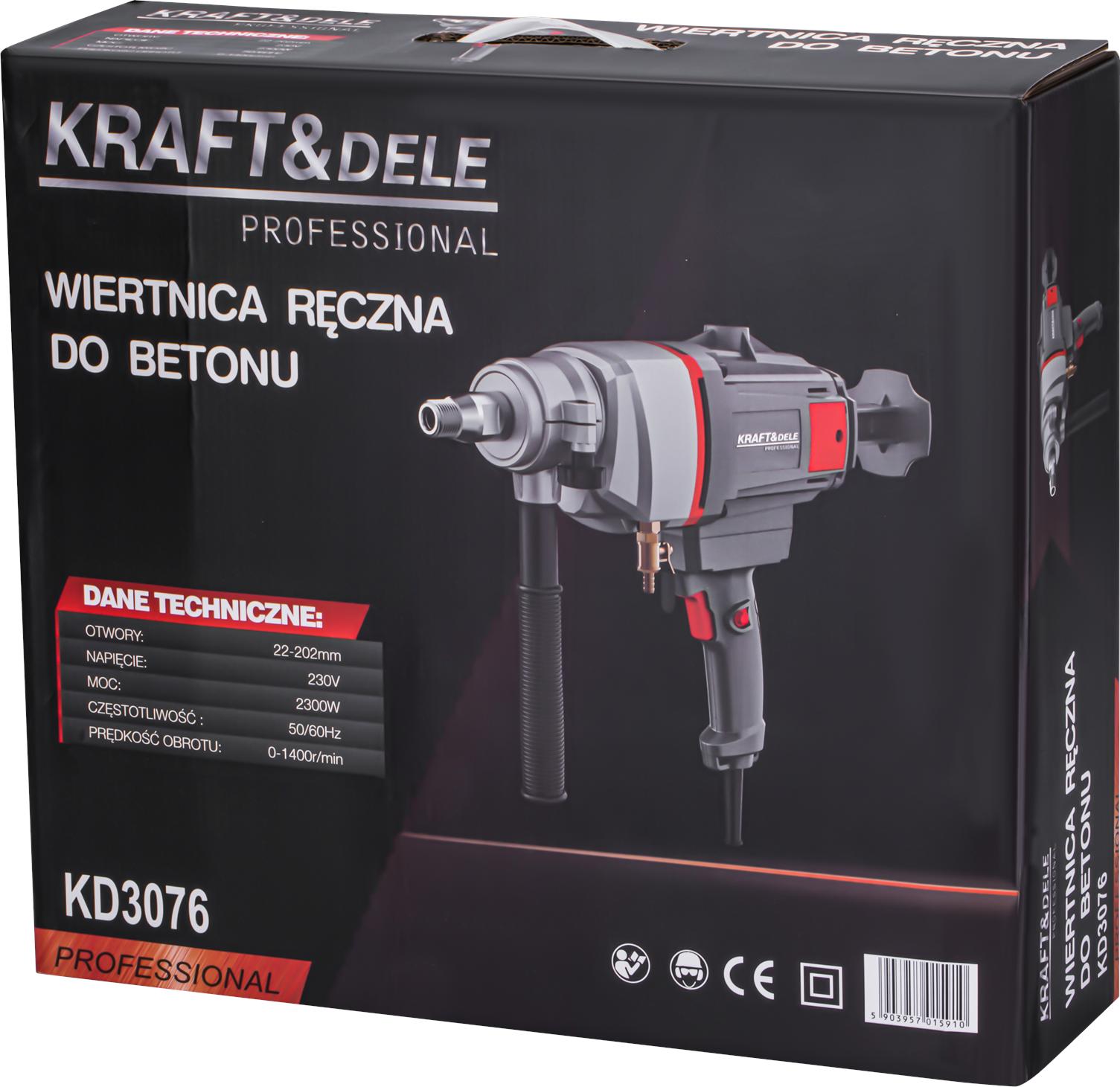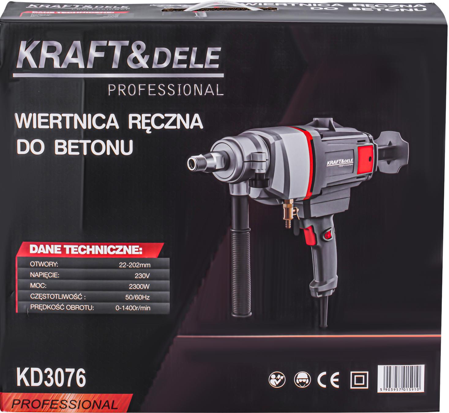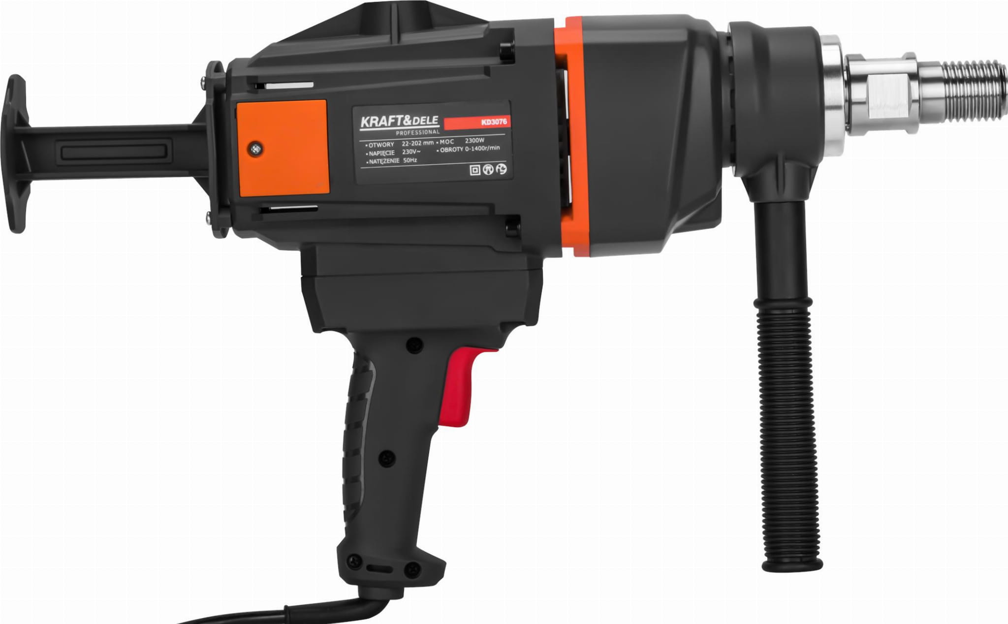 KD3076 to elektryczna wiertnica udarowa przeznaczona do wiercenia otworów o dużych średnicach w betonie, cegle, kamieniu i innych twardych materiałach budowlanych. Urządzenie współpracuje z koronami diamentowymi i umożliwia pracę zarówno na sucho, jak i na mokro.