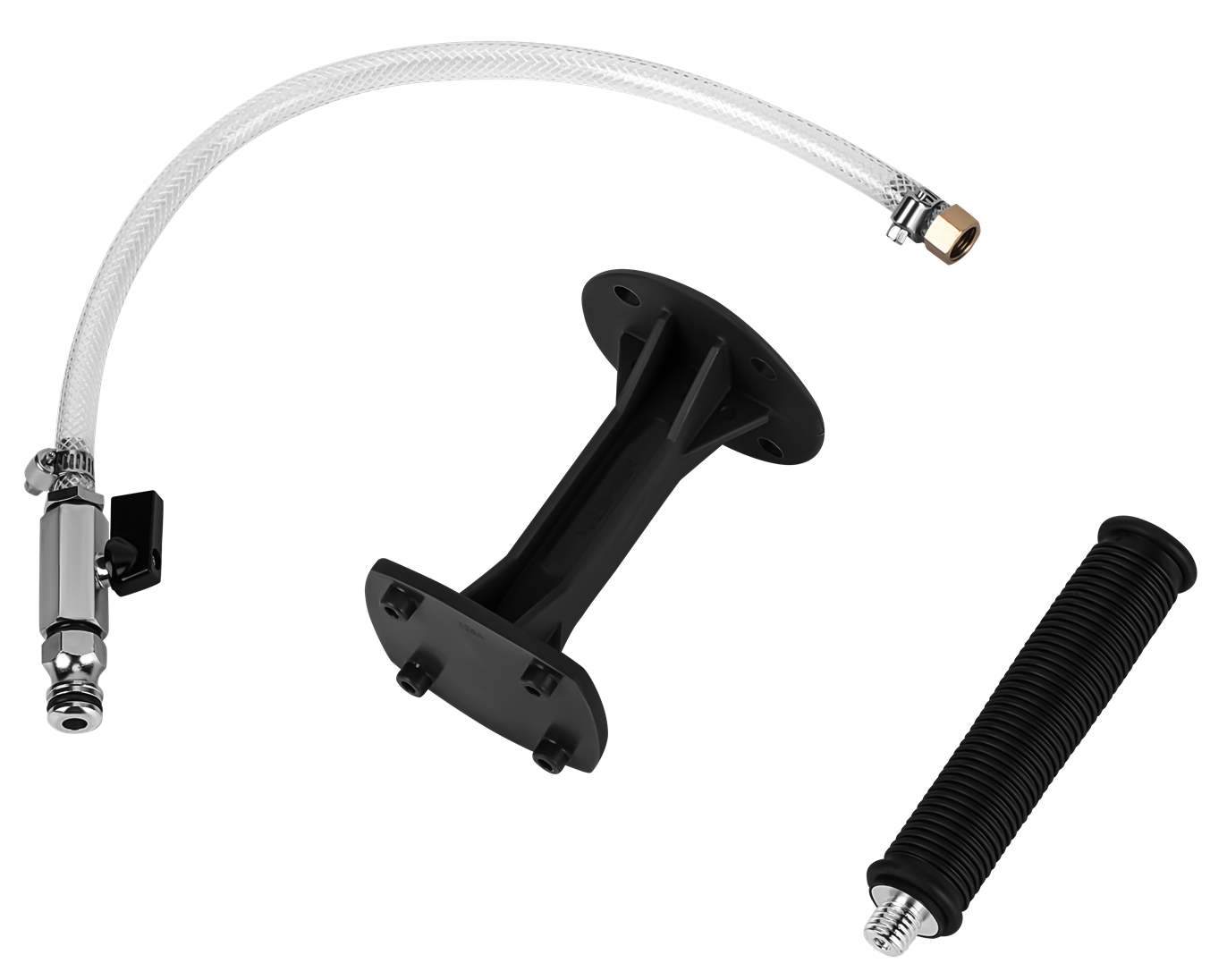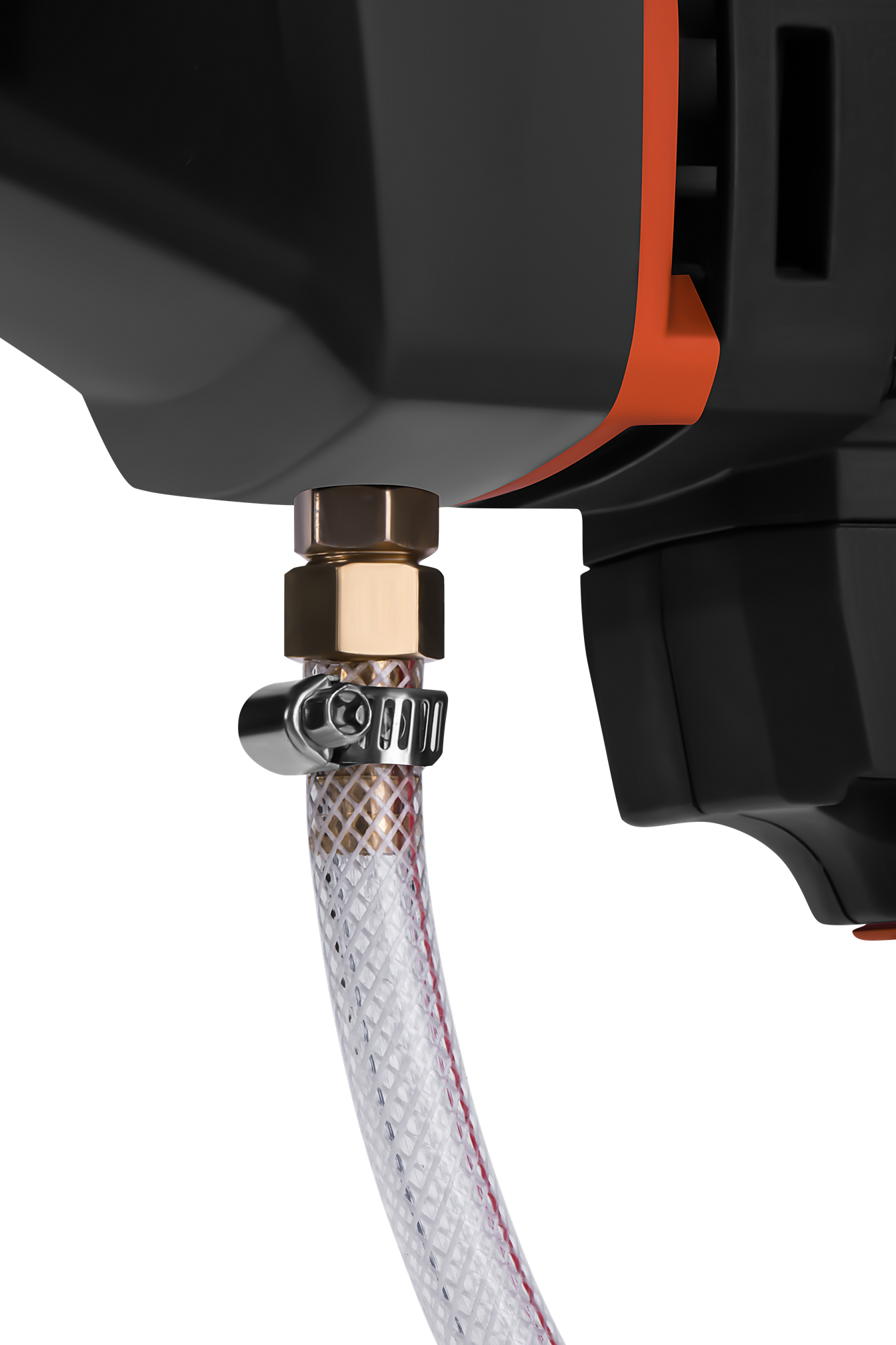 Układ chłodzenia wodnego odprowadza ciepło z miejsca wiercenia, co ogranicza przegrzewanie wiertła koronowego i wydłuża jego żywotność. Wężyk do podłączenia wody jest dołączony do zestawu.