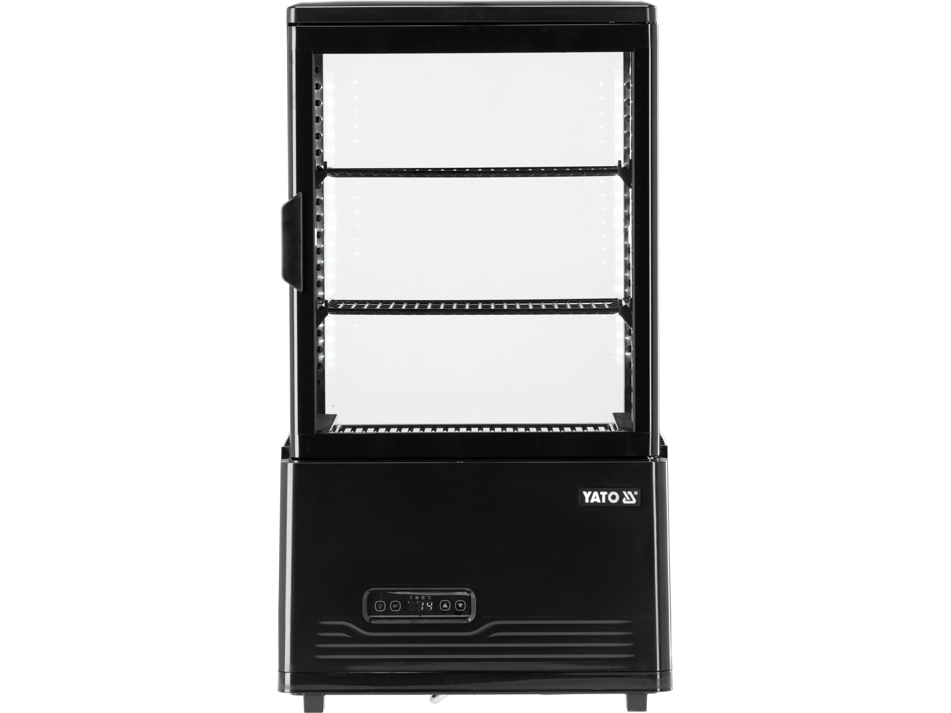 Kompaktowa witryna chłodnicza o pojemności 59 litrów przeznaczona do ekspozycji i przechowywania napojów, przekąsek oraz innych produktów wymagających chłodzenia. Czarna obudowa zapewnia estetyczny wygląd w punktach sprzedaży.