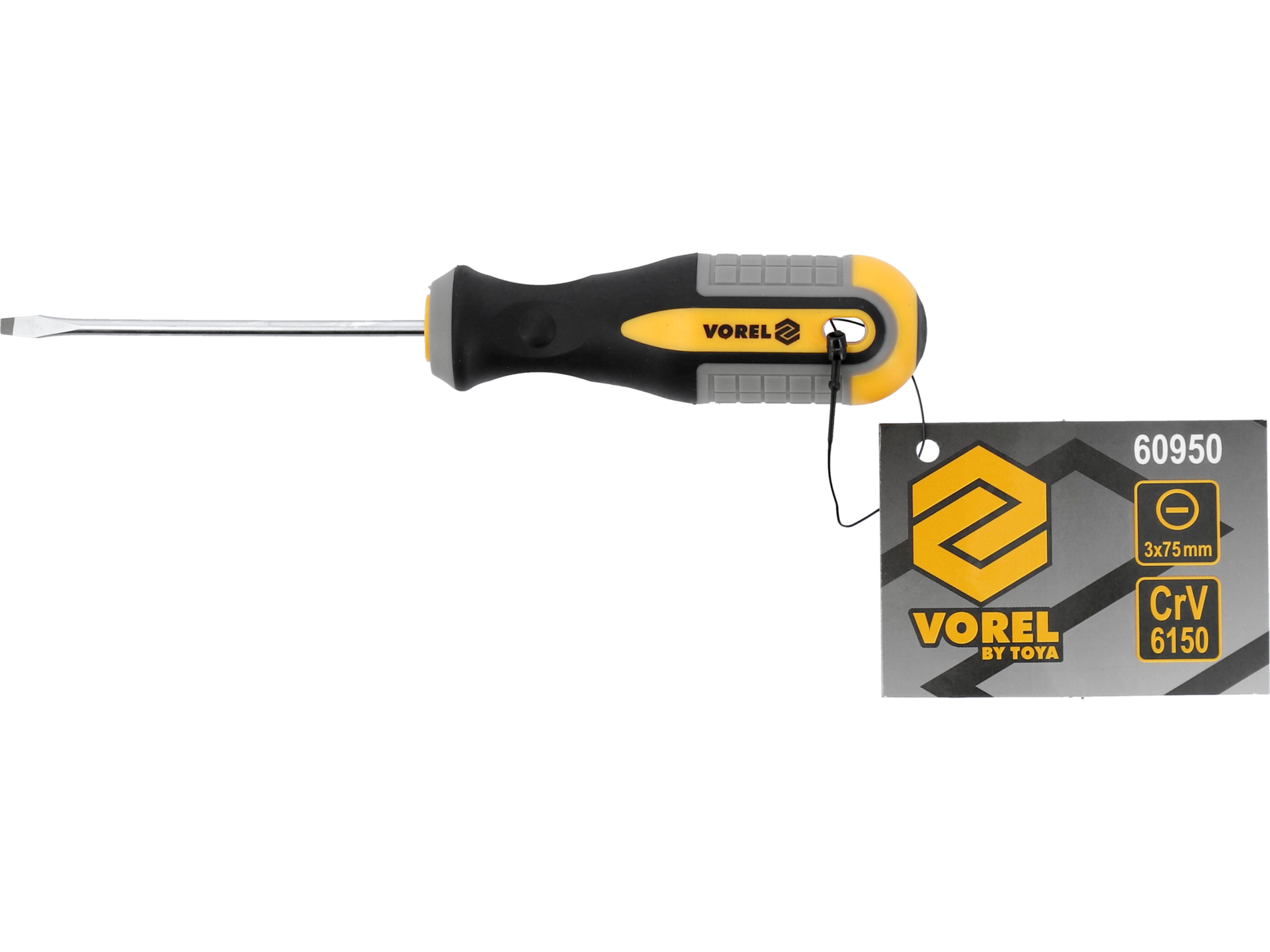 Wkrętak płaski z grotem 3 mm i długością trzpienia 75 mm, wykonany ze stali chromowo-wanadowej CrV. Narzędzie przeznaczone do wkręcania i wykręcania śrub z rowkiem płaskim w pracach montażowych, instalacyjnych i serwisowych.