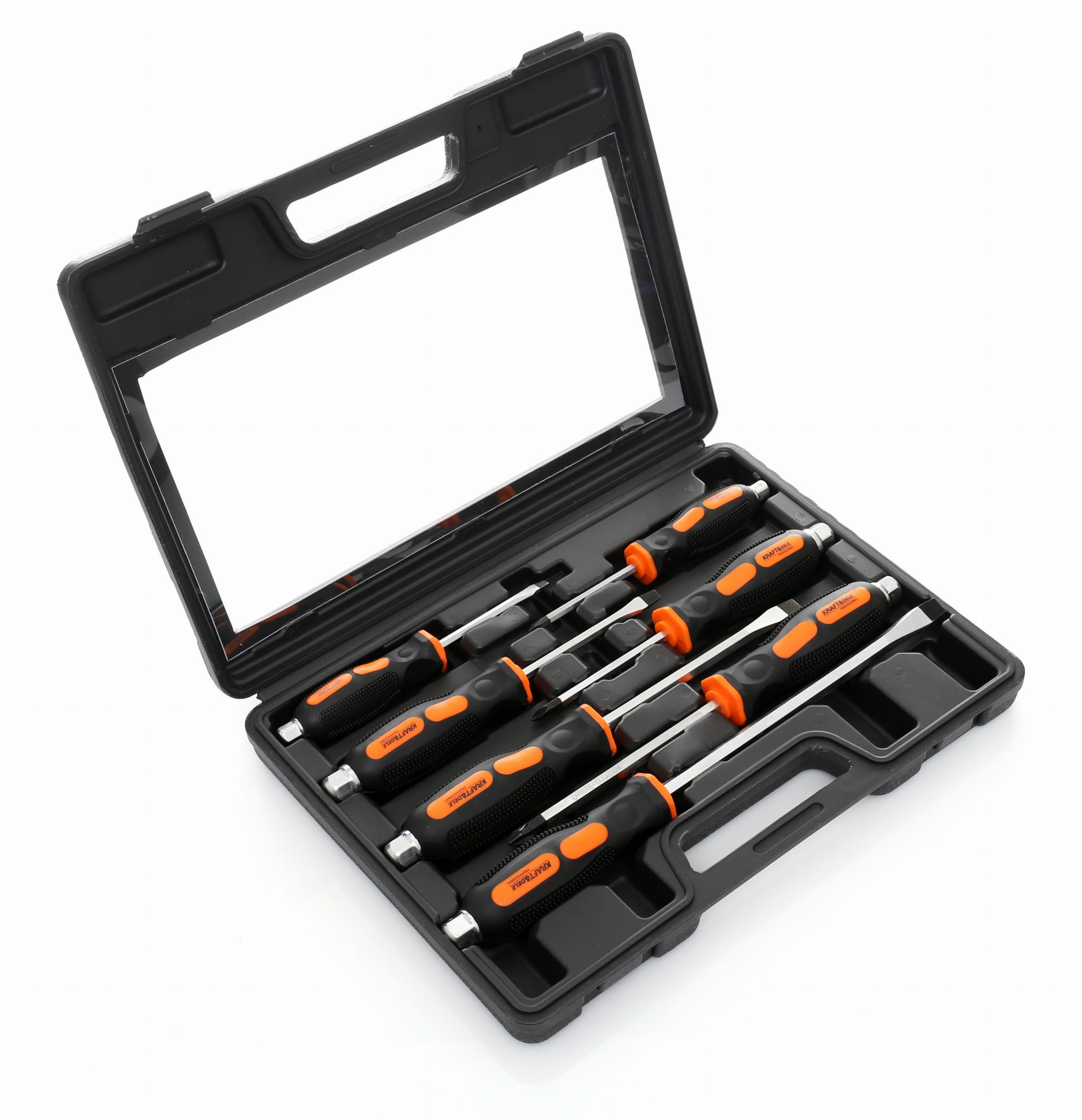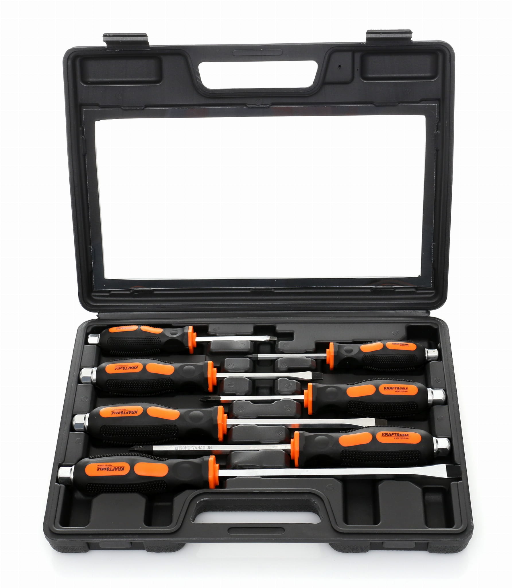 Zestaw siedmiu wkrętaków ślusarskich z trzpieniem przelotowym, przeznaczonych do pracy przy użyciu młotka lub klucza. Obejmuje cztery rozmiary wkrętaków płaskich oraz trzy krzyżakowe (PH1–PH3), wykonane ze stali chromowo-wanadowej z dodatkowo utwardzanymi końcówkami.