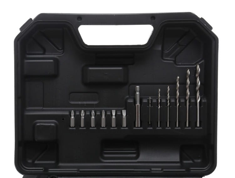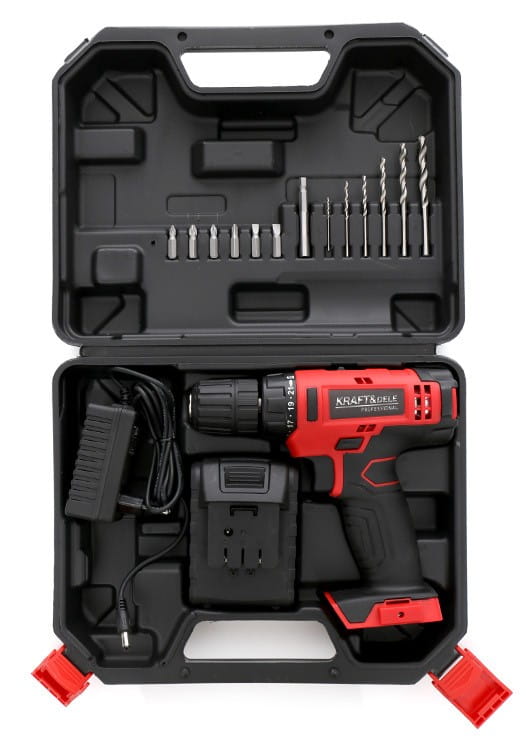 Wiertarko-wkrętarka KD1566, akumulator Li-Ion 1300 mAh, ładowarka, 6 bitów, 6 wierteł, uchwyt do bitów, walizka transportowa, instrukcja obsługi w języku polskim.