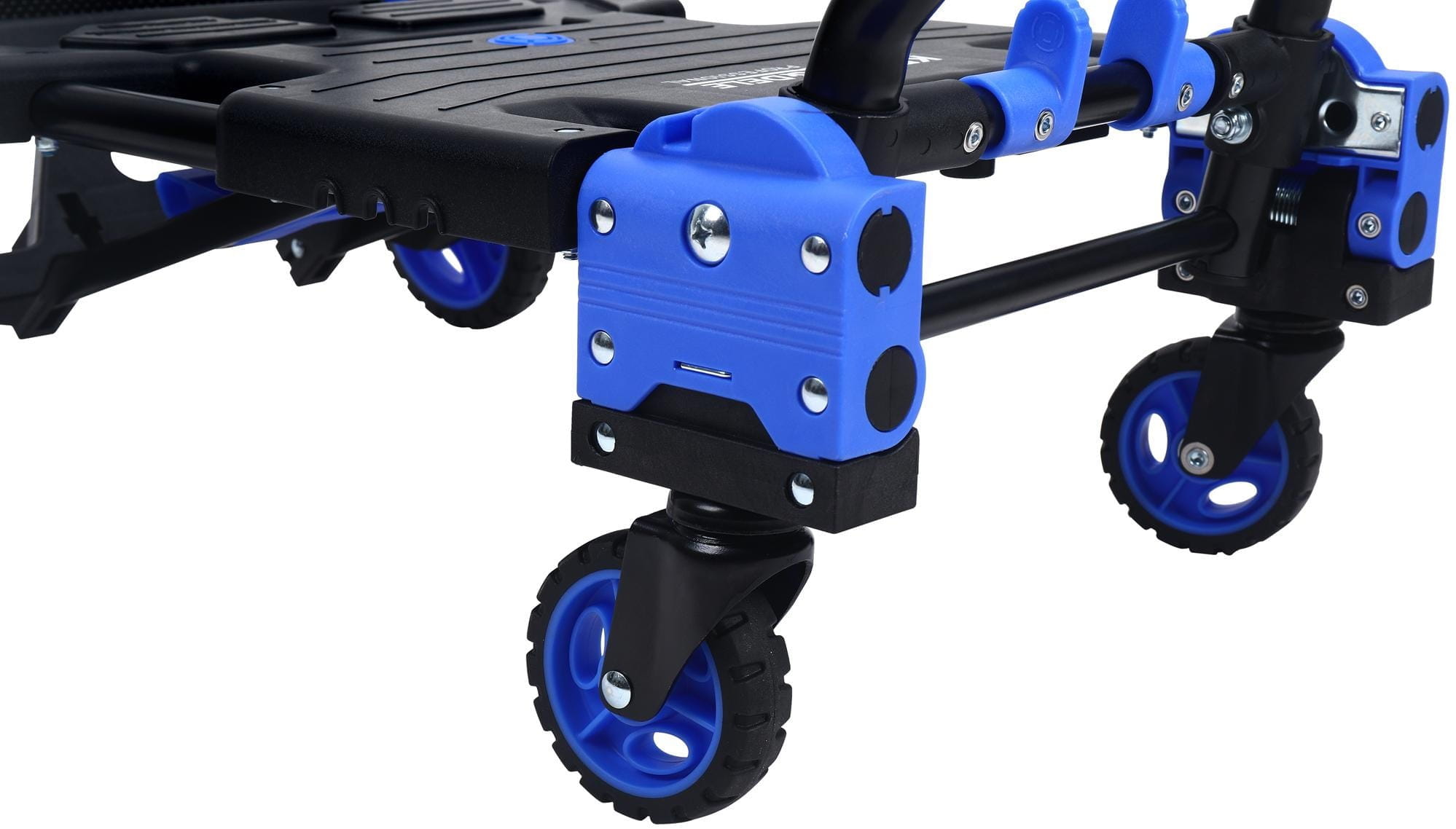 Wózek pracuje w dwóch konfiguracjach — jako wózek platformowy czterokołowy oraz jako wózek ręczny dwukołowy. Możliwość przełączania między trybami pozwala dostosować sposób transportu do rodzaju ładunku i warunków pracy.
