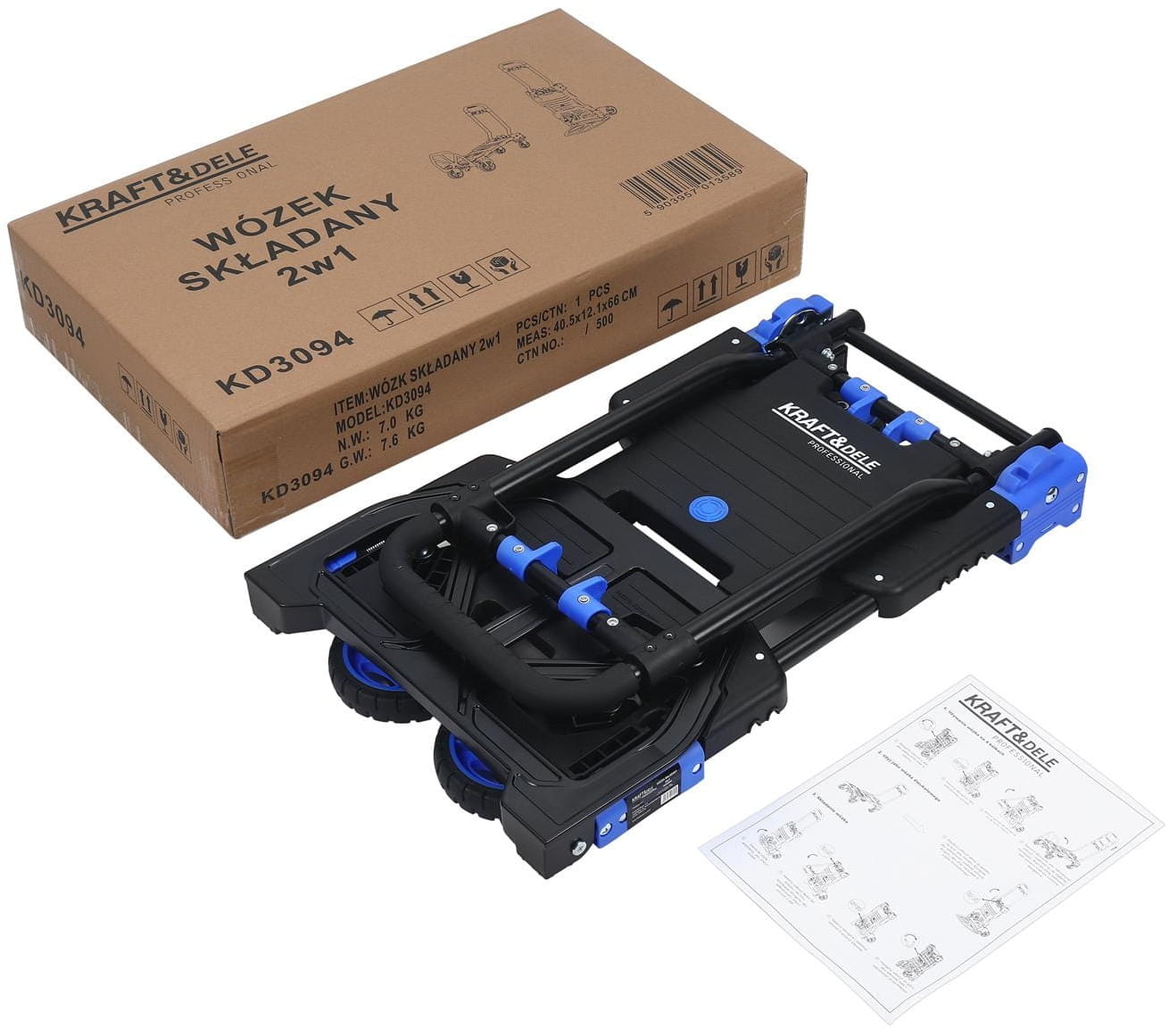 KD3094 to składany wózek platformowy marki Kraft&Dele, który łączy funkcję wózka platformowego i ręcznego. Przeznaczony do transportu ciężkich i nieporęcznych ładunków zarówno w środowiskach magazynowych, jak i w zastosowaniach domowych czy warsztatowych.