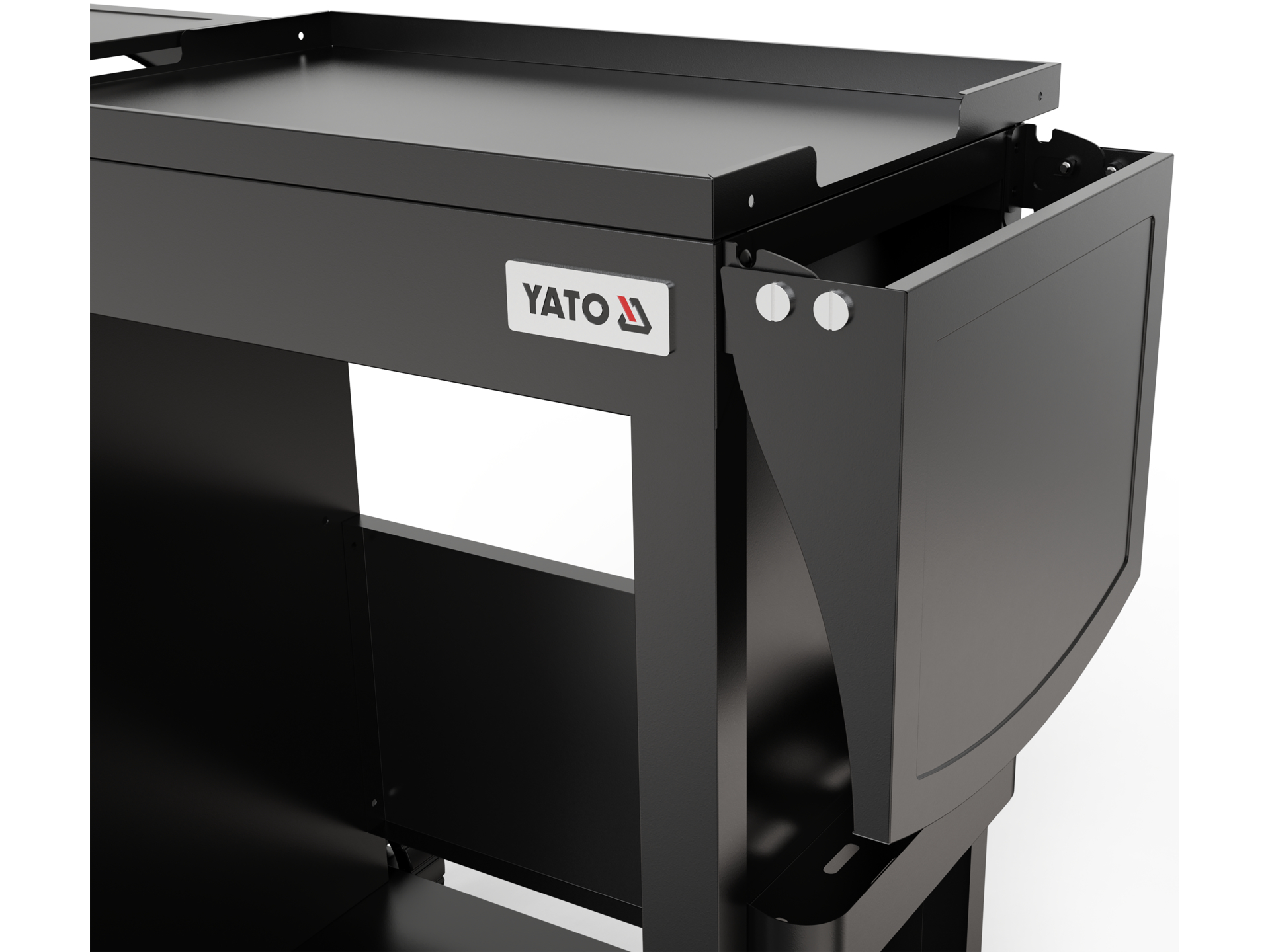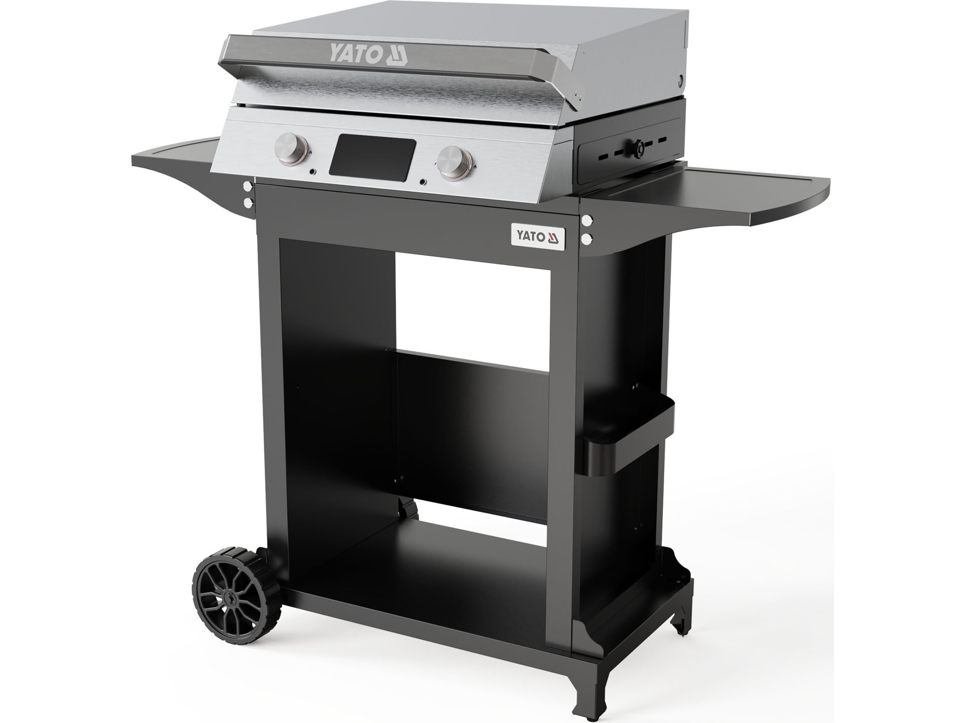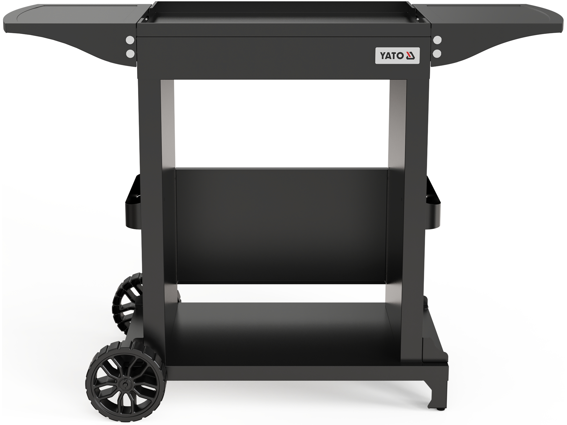 Mobilny stolik roboczy zaprojektowany do grilla elektrycznego YATO YG-20071. Konstrukcja wyposażona w kółka transportowe, składane blaty boczne i półki na akcesoria zwiększa funkcjonalność przestrzeni grillowej.