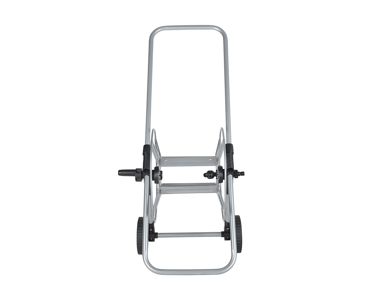 Mobilny wózek z metalową ramą i bębnem do przechowywania oraz nawijania węża ogrodowego o średnicy 1/2" i długości do 60 m. Konstrukcja wyposażona w ręczną korbę oraz koła transportowe umożliwiające przemieszczanie po różnych nawierzchniach.