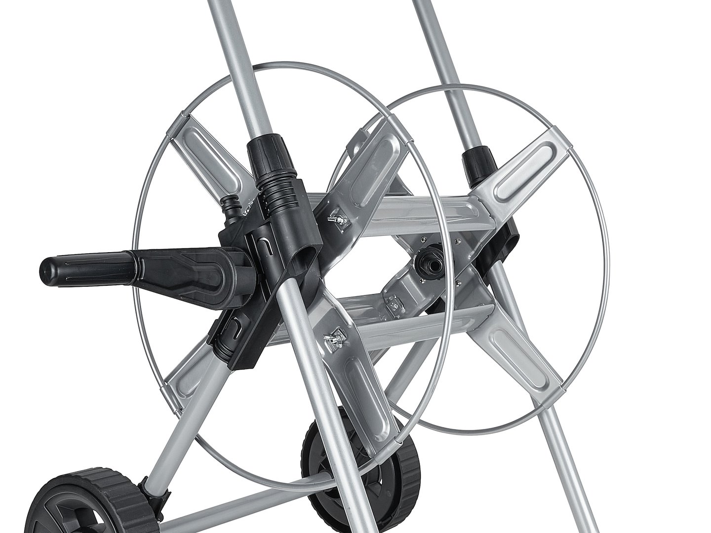 Duże koła umożliwiają przemieszczanie wózka po trawie, żwirze, kostce brukowej i innych nierównych nawierzchniach ogrodowych bez konieczności przenoszenia całego zestawu. Waga ok. 3,15 kg sprawia, że obsługa jest wygodna nawet z pełnym bębnem.