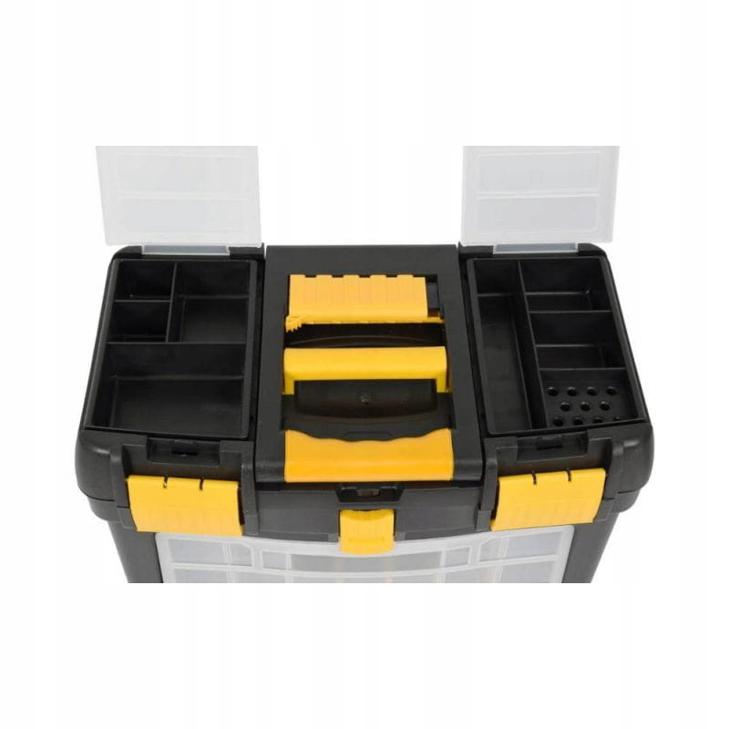 Wózek zawiera trzy oddzielne skrzynki o wymiarach 335x190x200 mm (dwie) oraz 335x215x75 mm (jedna płytsza). Podział na segmenty umożliwia oddzielne przechowywanie narzędzi różnych kategorii — np. kluczy, wkrętaków i materiałów eksploatacyjnych — bez ich mieszania.