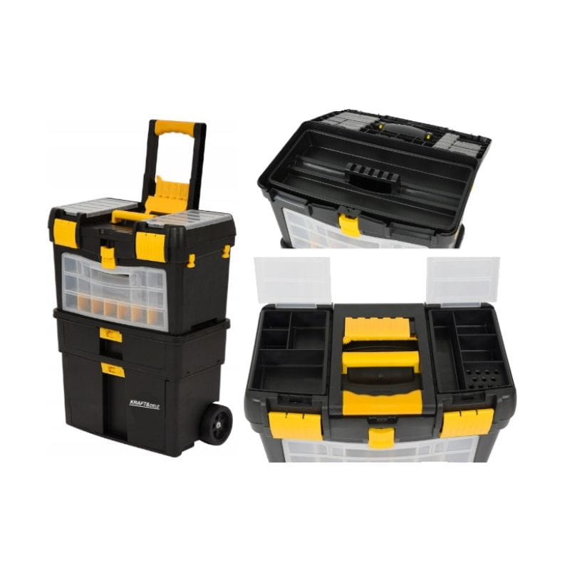 KD1075 to mobilny wózek warsztatowy wykonany z polipropylenu, przeznaczony do transportu i przechowywania narzędzi ręcznych w warsztacie, garażu lub na miejscu pracy. Konstrukcja składa się z trzech segmentów skrzynkowych oraz zintegrowanego organizera, co pozwala na segregację narzędzi według rozmiaru i przeznaczenia.