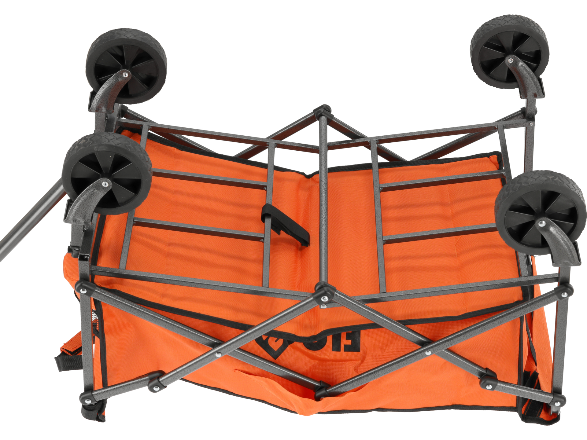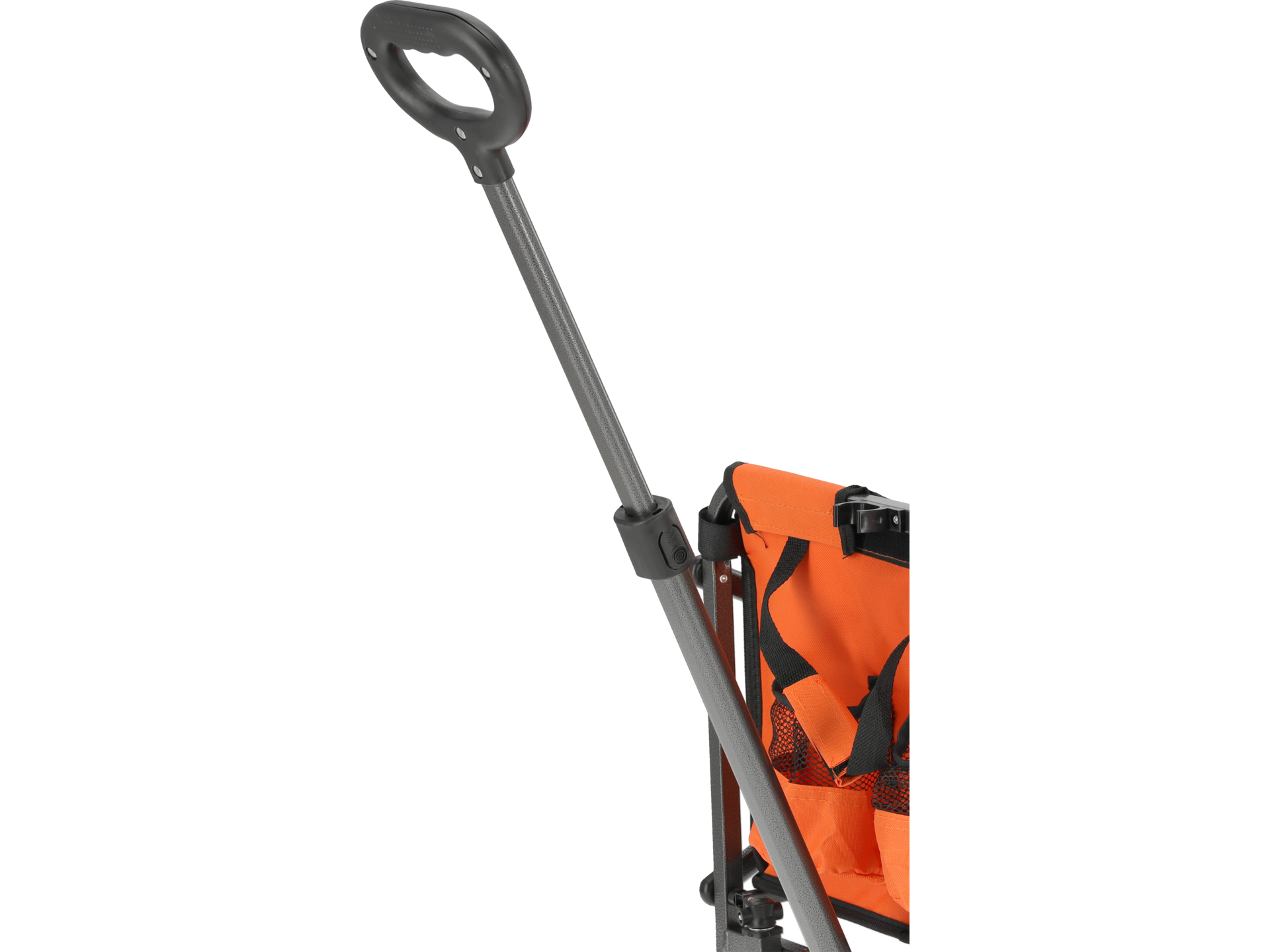 Składany wózek transportowy o udźwigu 70 kg z konstrukcją ze stalowych profili malowanych proszkowo i pokrowcem z tkaniny Oxford 600D. Wyposażony w teleskopową rączką oraz cztery kółka PVC z obrotowymi przednimi kołami zapewniającymi pełną manewrowość.