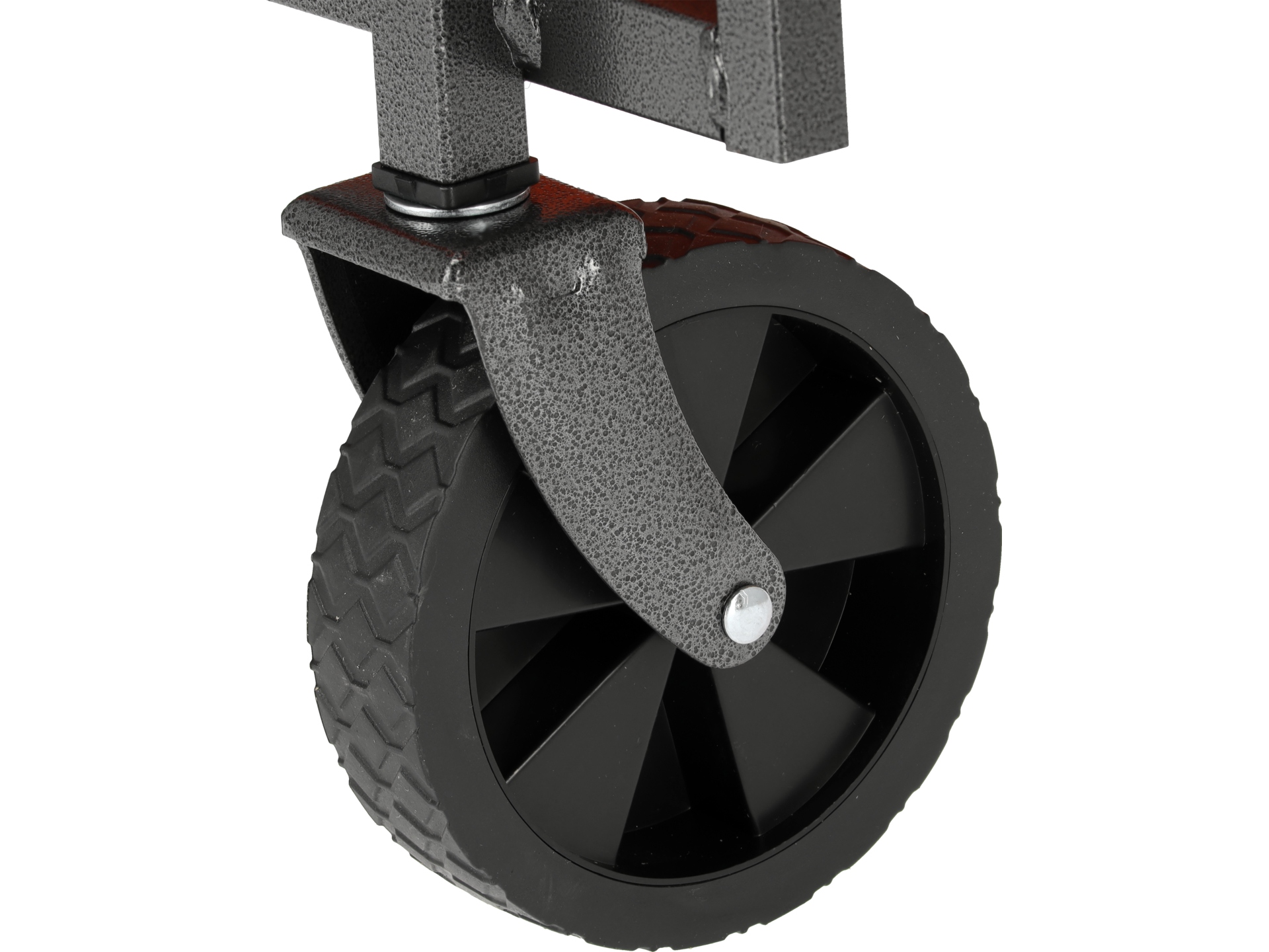 System czterech kółek PVC o średnicy 110 mm i szerokości 27 mm z obrotowymi przednimi kołami zapewnia pełną manewrowość w ograniczonej przestrzeni. Mechanizm obrotu 360° pozwala na łatwe pokonywanie zakrętów bez konieczności podnoszenia wózka. Kółka z PVC nie pozostawiają śladów na powierzchniach i charakteryzują się cichą pracą.
