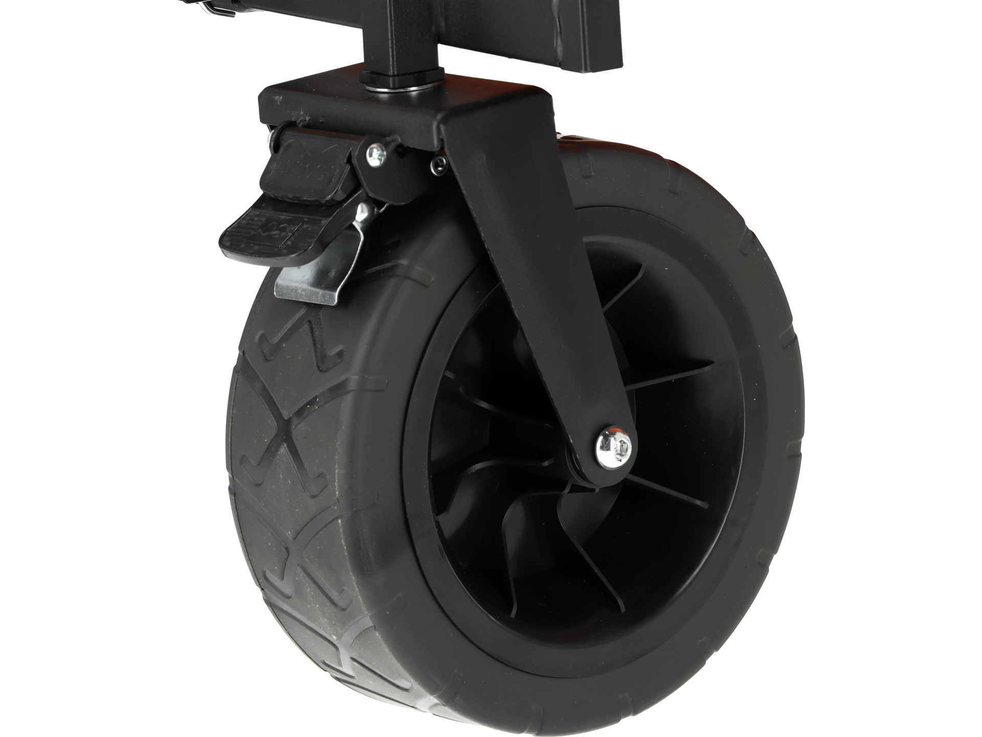 Wytrzymały stelaż wykonany ze stalowych profili malowanych proszkowo, w połączeniu z podwójną tkaniną Oxford 600D, zapewnia niezrównaną trwałość i odporność na uszkodzenia. Przednie kółka skrętne 360° z hamulcami gwarantują łatwe prowadzenie i manewrowanie w różnych warunkach terenowych, a szerokie opony zapewniają stabilność i komfort jazdy.