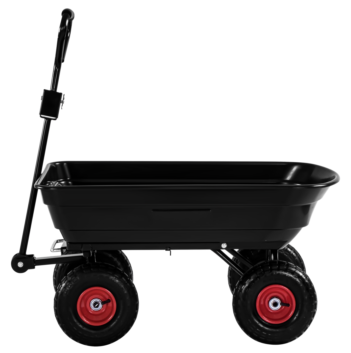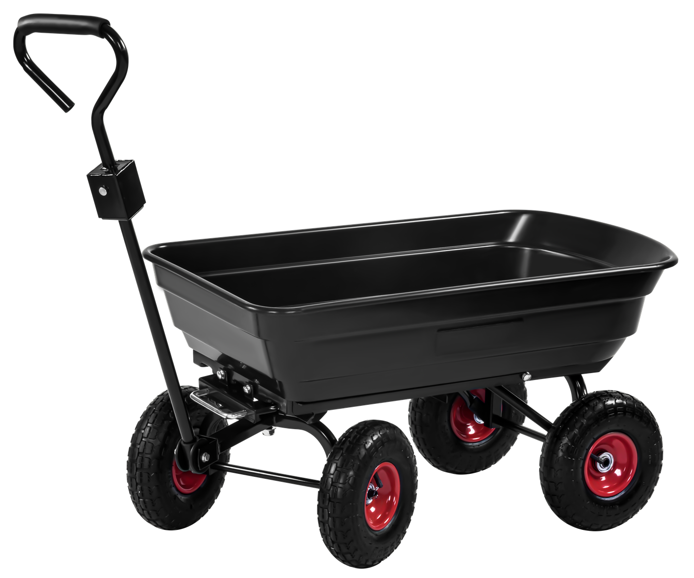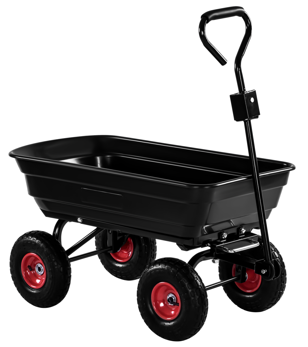 Skrzynia wyposażona jest w mechanizm przechyłu, który pozwala opróżnić ładunek bez konieczności ręcznego przerzucania zawartości. Rozwiązanie szczególnie przydatne przy materiałach sypkich: ziemi, piasku, żwirze czy kompoście.