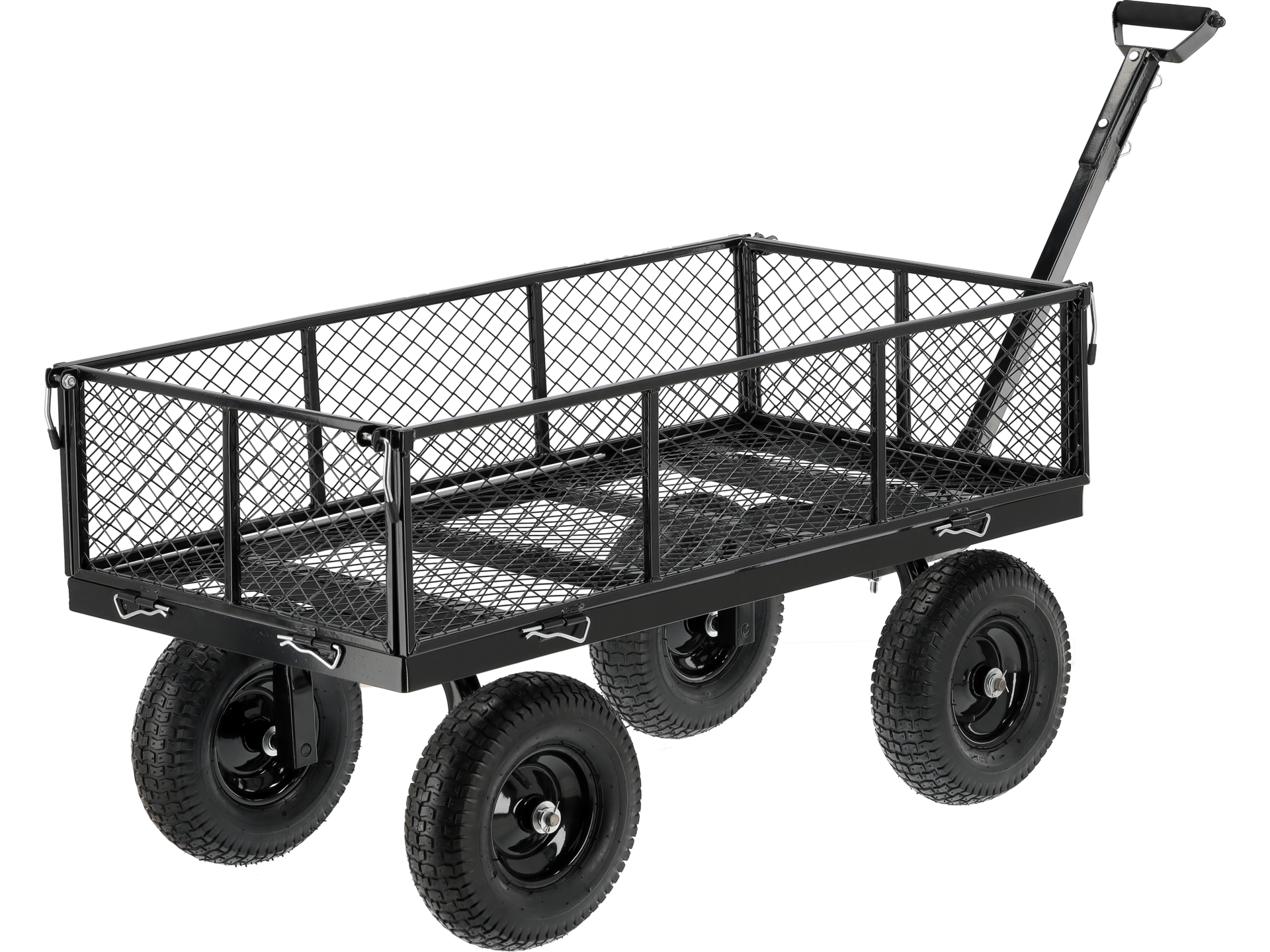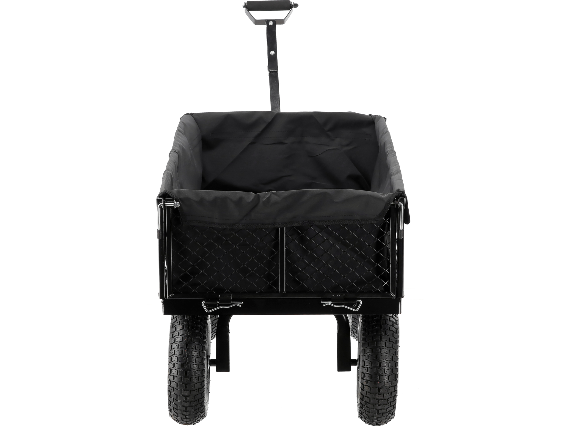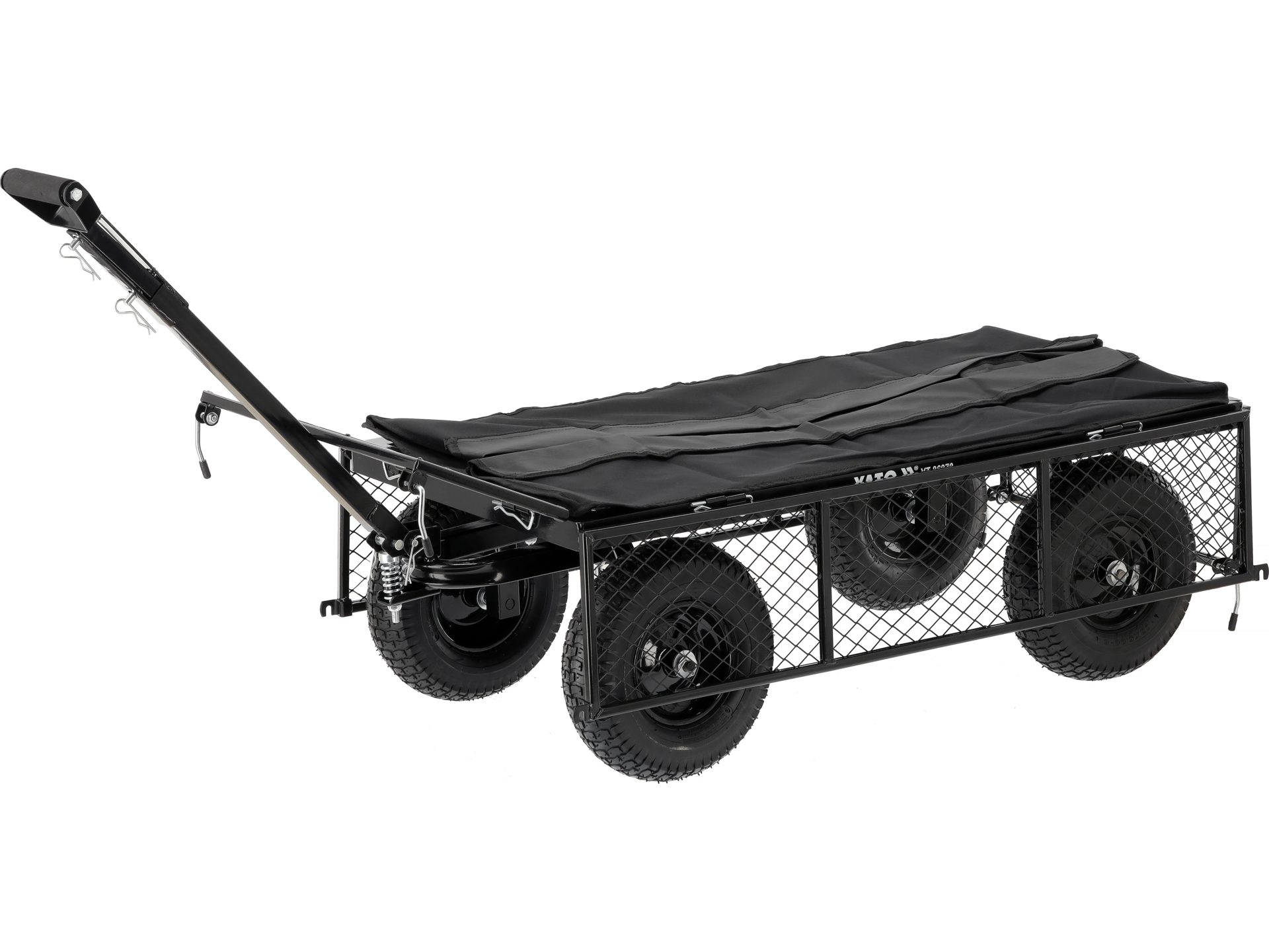 Czterokołowy wózek transportowy o wzmocnionej konstrukcji stalowej, przeznaczony do przewozu materiałów sypkich i ciężkich ładunków w ogrodzie oraz na placu budowy. Wyposażony w szczelny pokrowiec wewnętrzny oraz funkcję przyczepki ogrodowej.