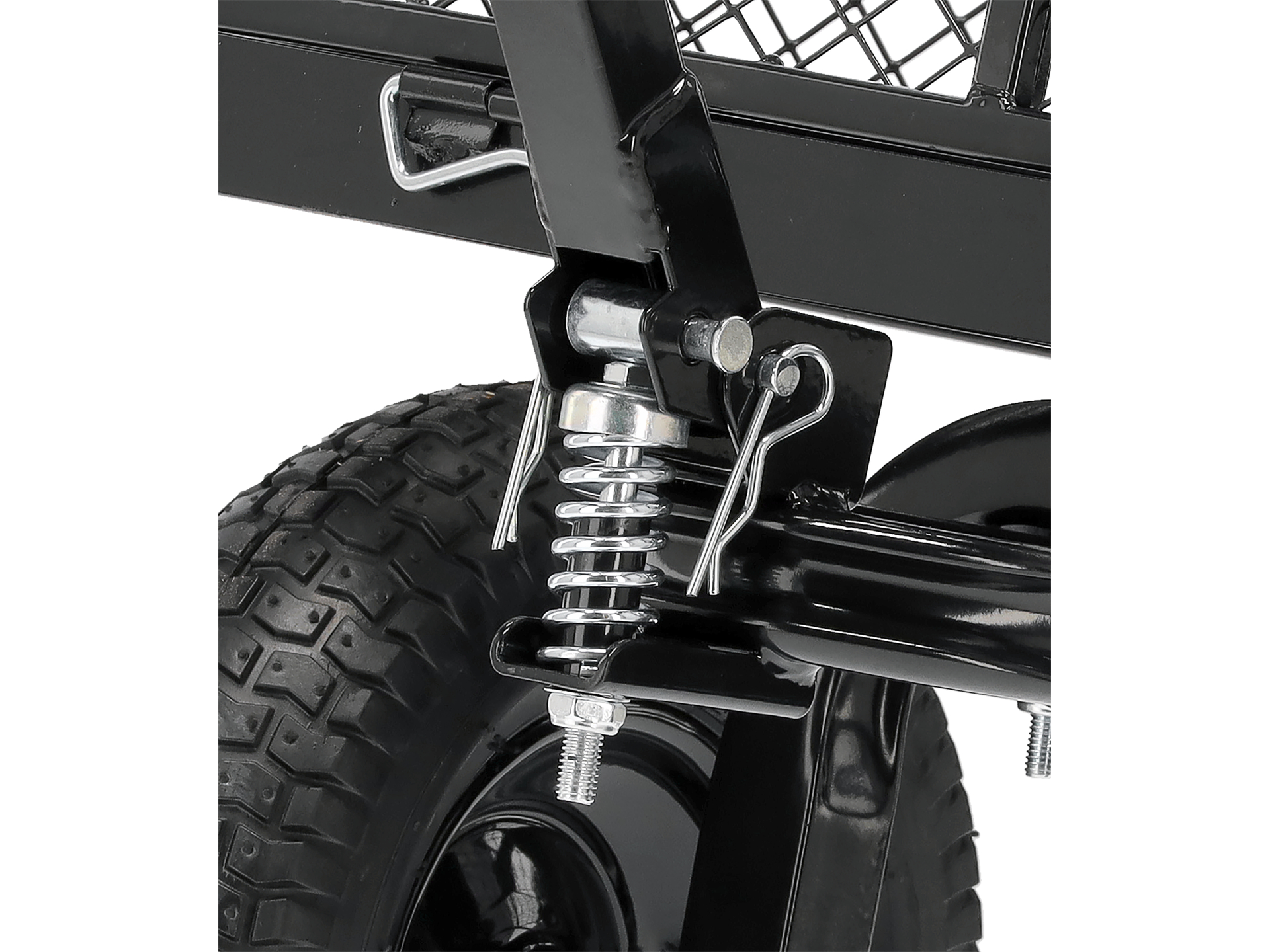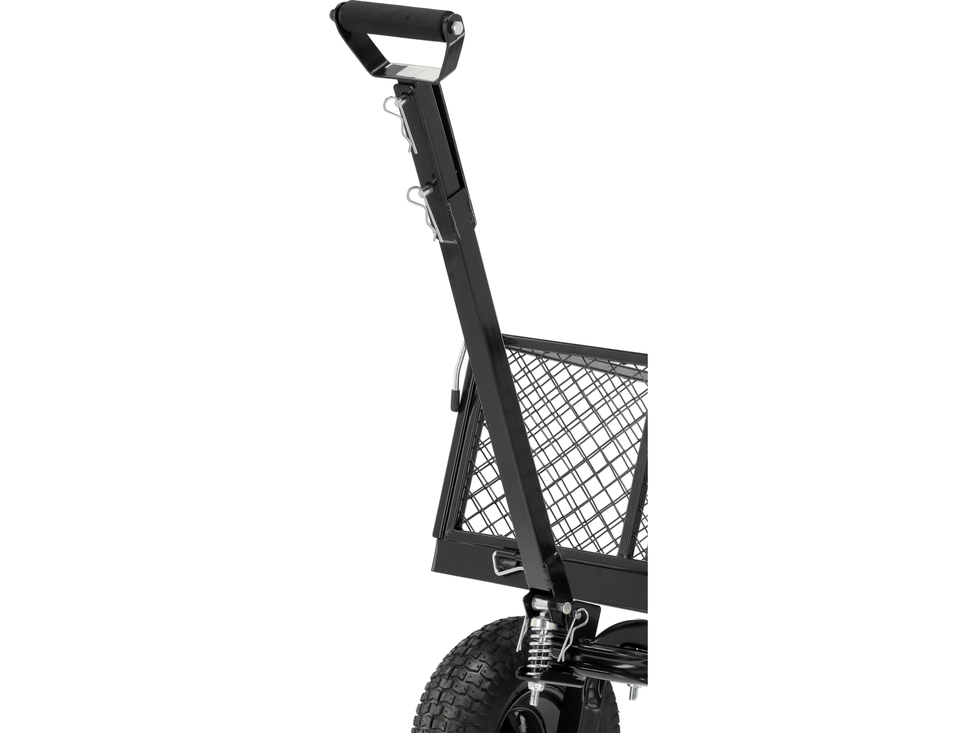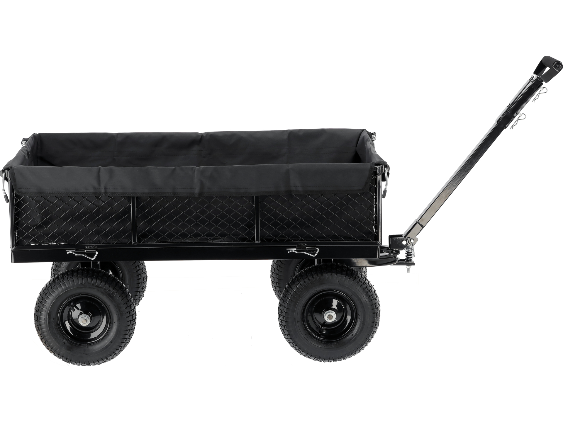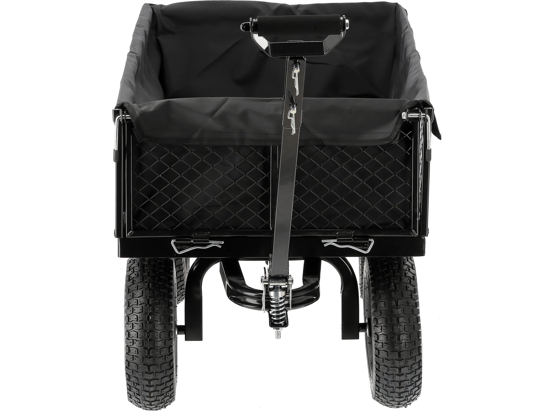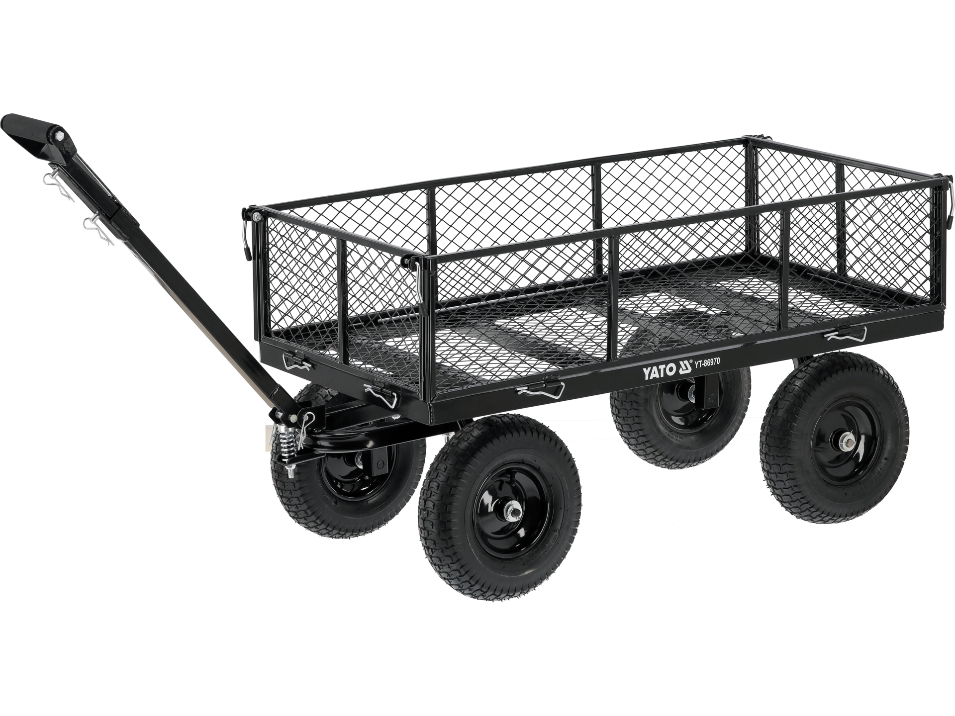 Skrętna przednia oś zwiększa zwrotność wózka, ułatwiając manewrowanie w wąskich przejściach i wokół przeszkód. Dyszel wyposażony w sprężynę utrzymuje pozycję poziomą podczas postoju, co zapobiega opadaniu i ułatwia podczepienie do ciągnika ogrodowego lub quada.