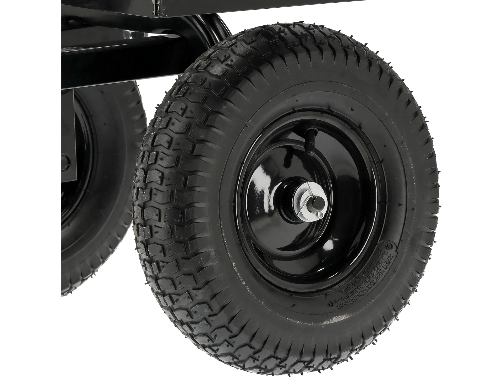 Cztery koła pneumatyczne o średnicy 330 mm i szerokości 120 mm z bieżnikiem terenowym. Łożyskowanie redukuje opór toczenia, a pompowane opony amortyzują nierówności terenu. Rozmiar 13" x 5-6 oznacza średnicę obręczy 13 cali oraz szerokość opony 5-6 cali, co zapewnia stabilność przy pełnym obciążeniu.