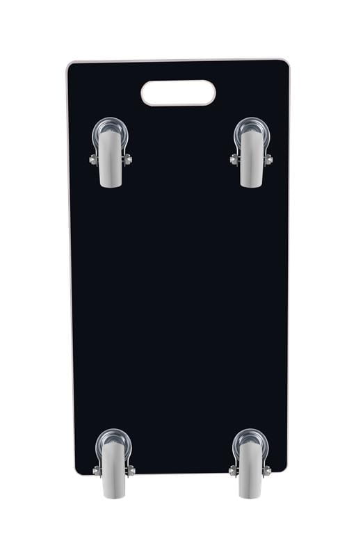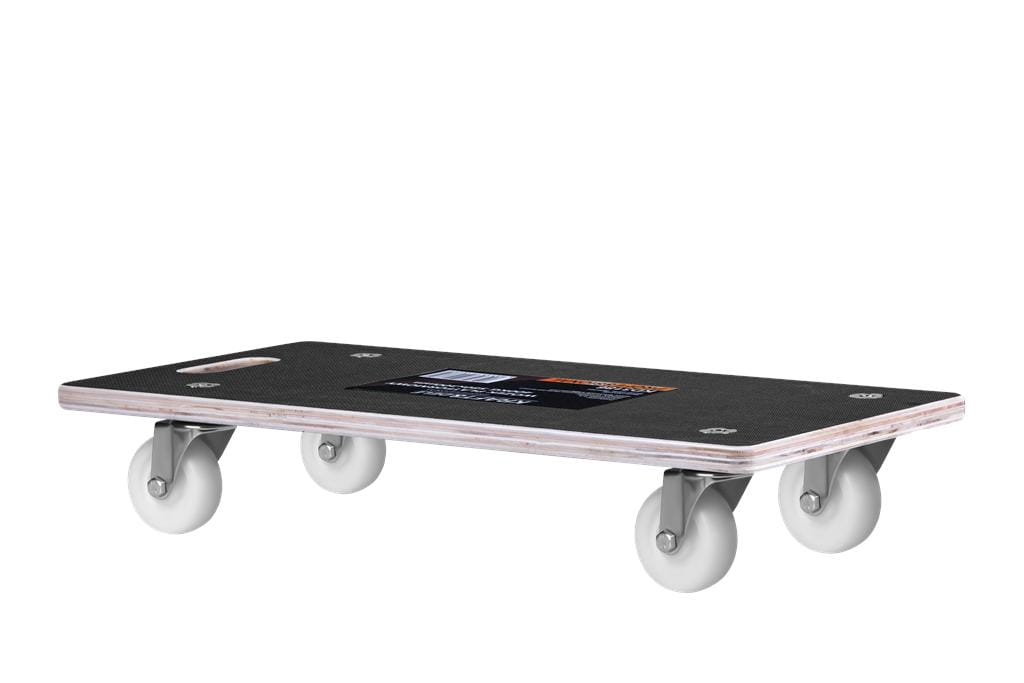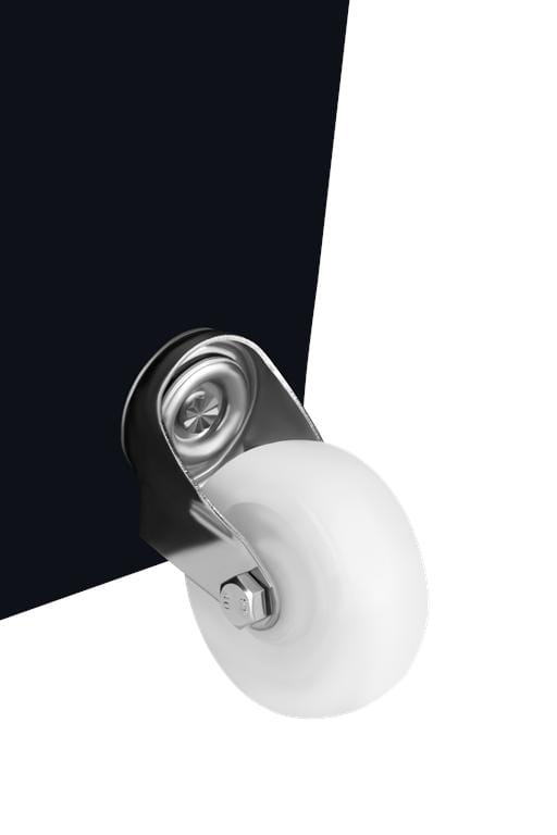 Każde z czterech kół obraca się o 360°, co umożliwia jazdę w dowolnym kierunku — w tym ruch boczny — bez konieczności zawracania. Gumowa bieżnia chroni podłogę przed zarysowaniem i tłumi drgania podczas transportu po nierównościach.