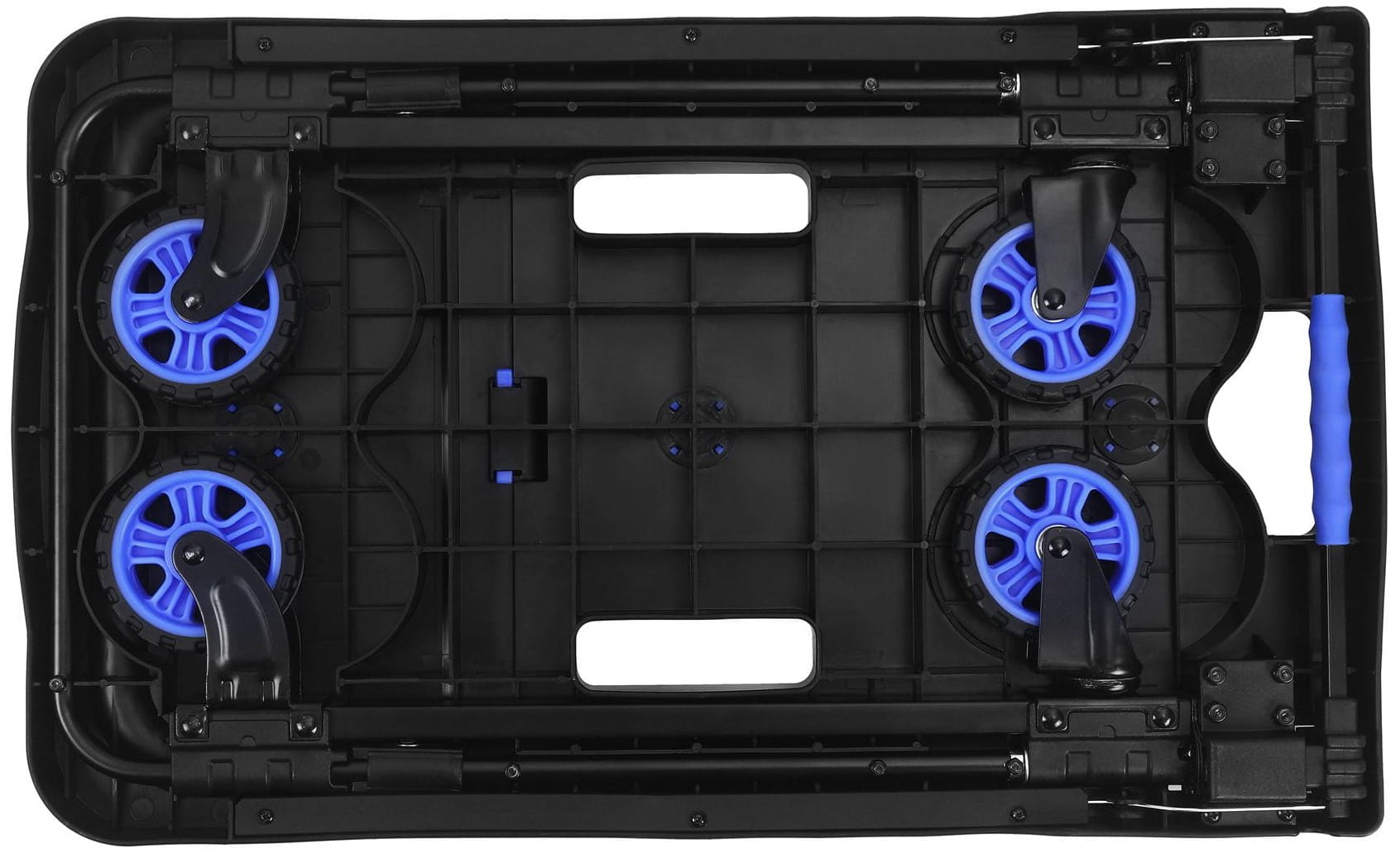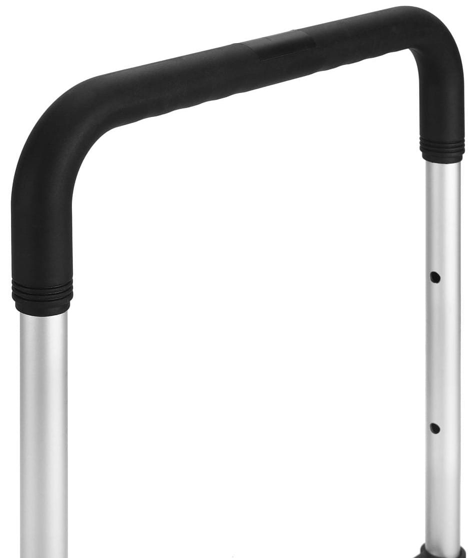 Rączka składa się i pozwala na regulację długości, co umożliwia dostosowanie pozycji prowadzenia do wzrostu użytkownika. Po złożeniu wózek osiąga grubość zaledwie 9 cm, co ułatwia przechowywanie w wąskich przestrzeniach — szafach, schowkach czy między regałami.