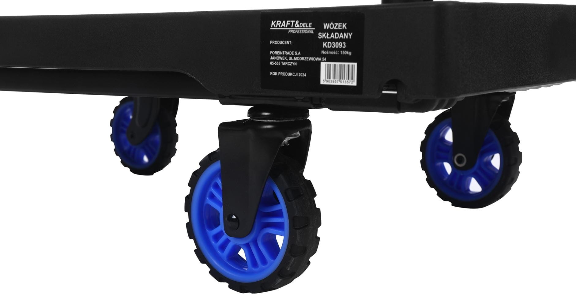 Dwa koła skrętne z przodu zapewniają swobodę manewrowania w ciasnych przejściach i przy zakrętach. Dwa koła stałe z tyłu stabilizują ruch podczas transportu w linii prostej. Taki układ jest standardem w wózkach platformowych do użytku magazynowego.