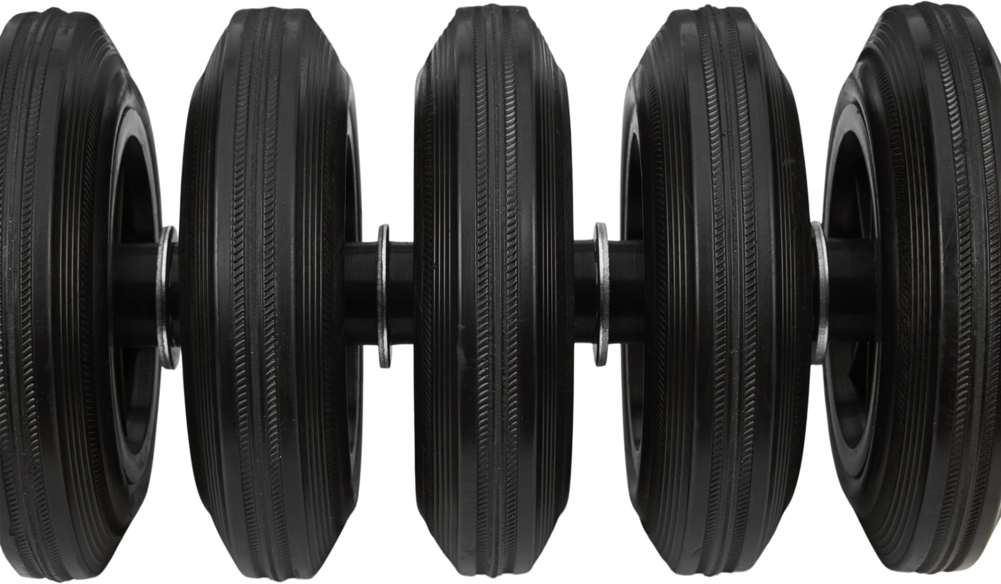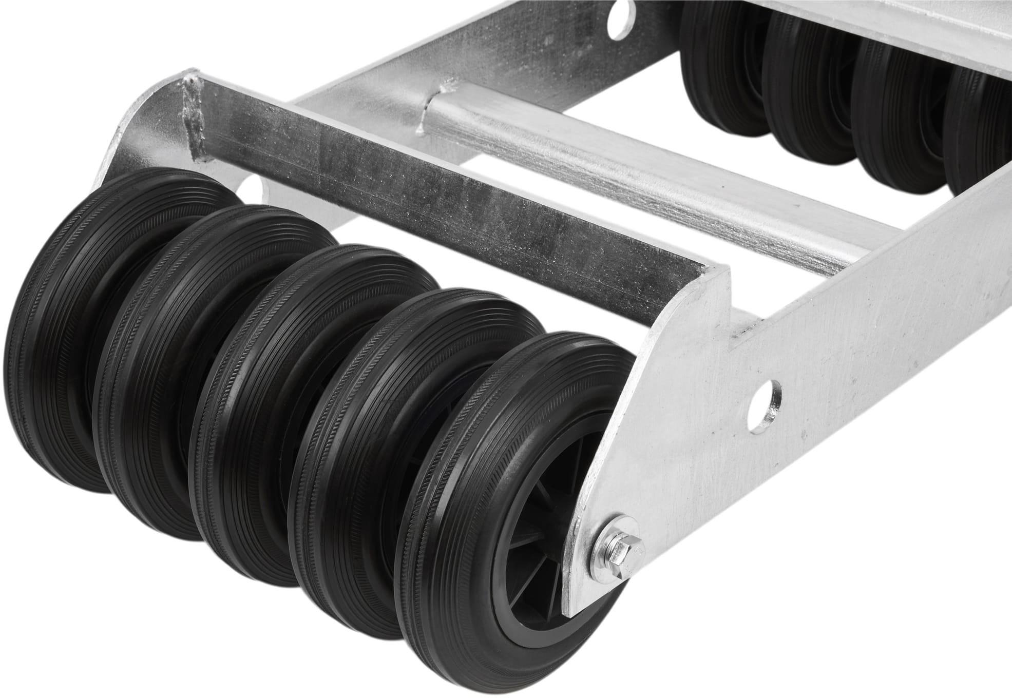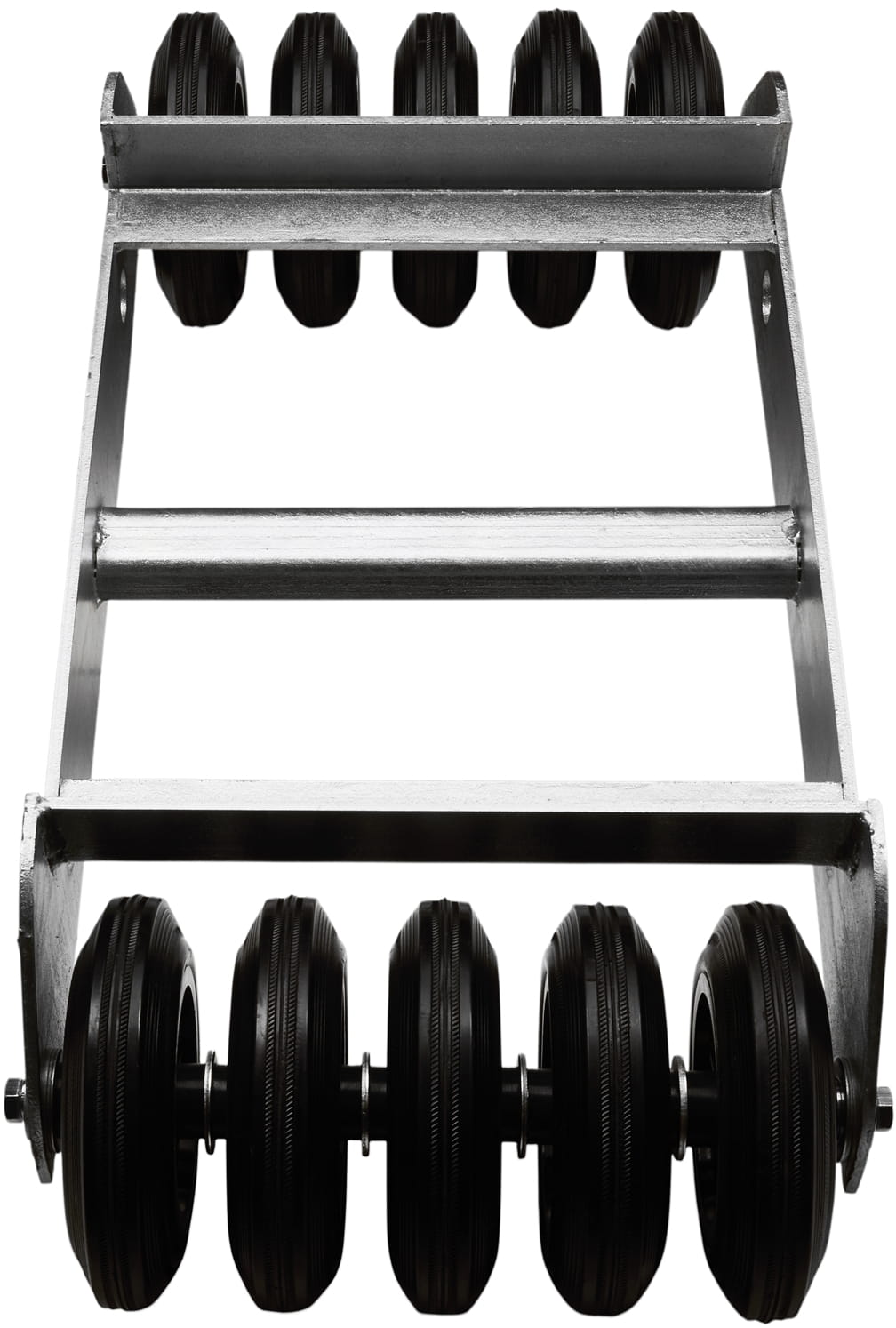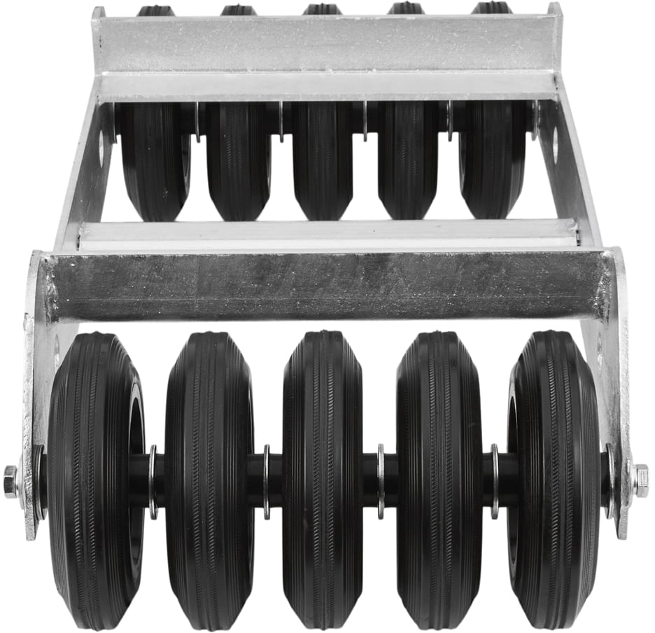 Układ 10 kół (5 na każdą stronę ramy) równomiernie rozkłada obciążenie na podłoże i eliminuje punktowe naprężenia. Gumowa bieżnia amortyzuje nierówności nawierzchni i chroni posadzkę przed zarysowaniem, a poliamidowy rdzeń zachowuje sztywność pod dużym ciężarem.