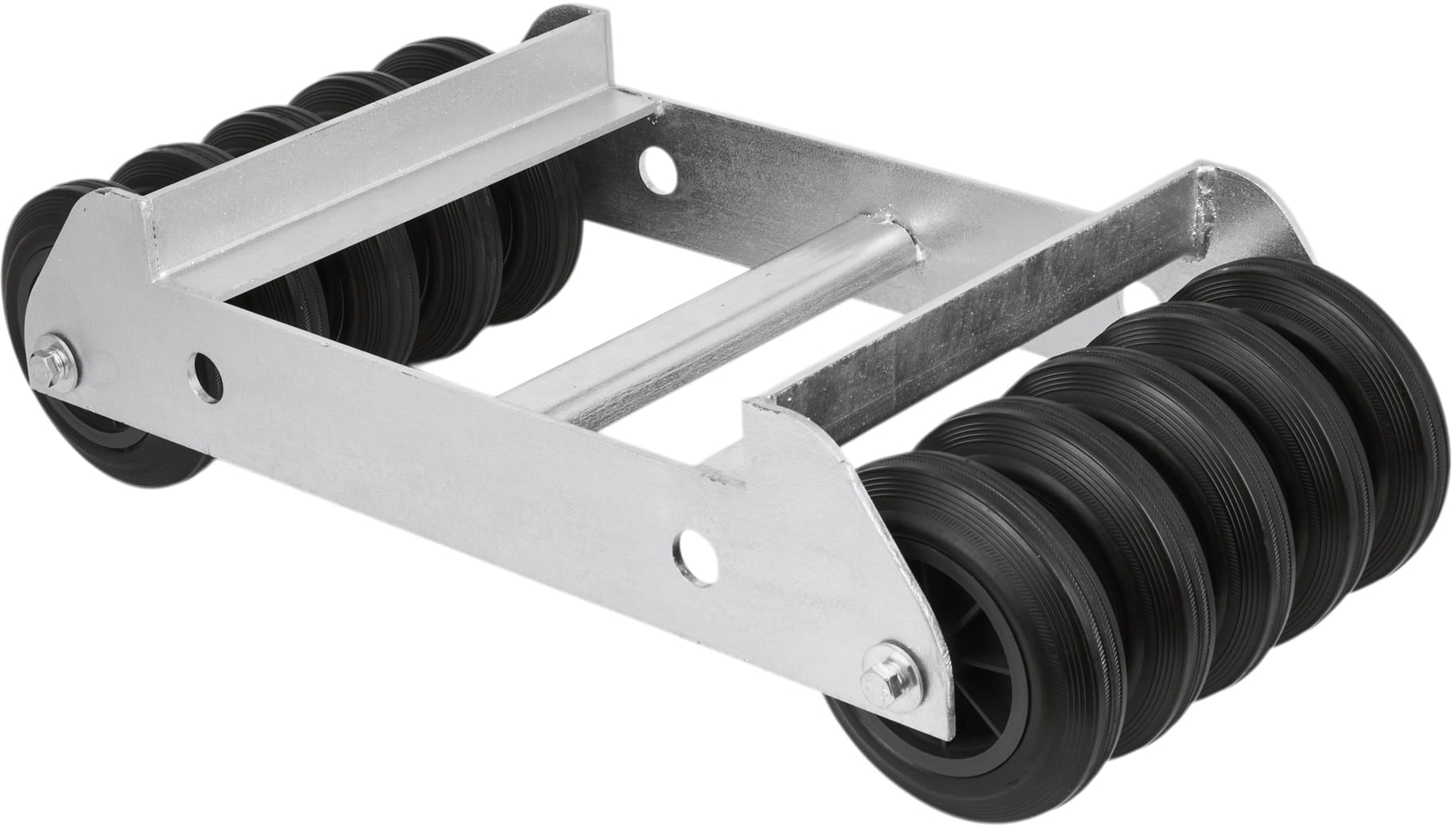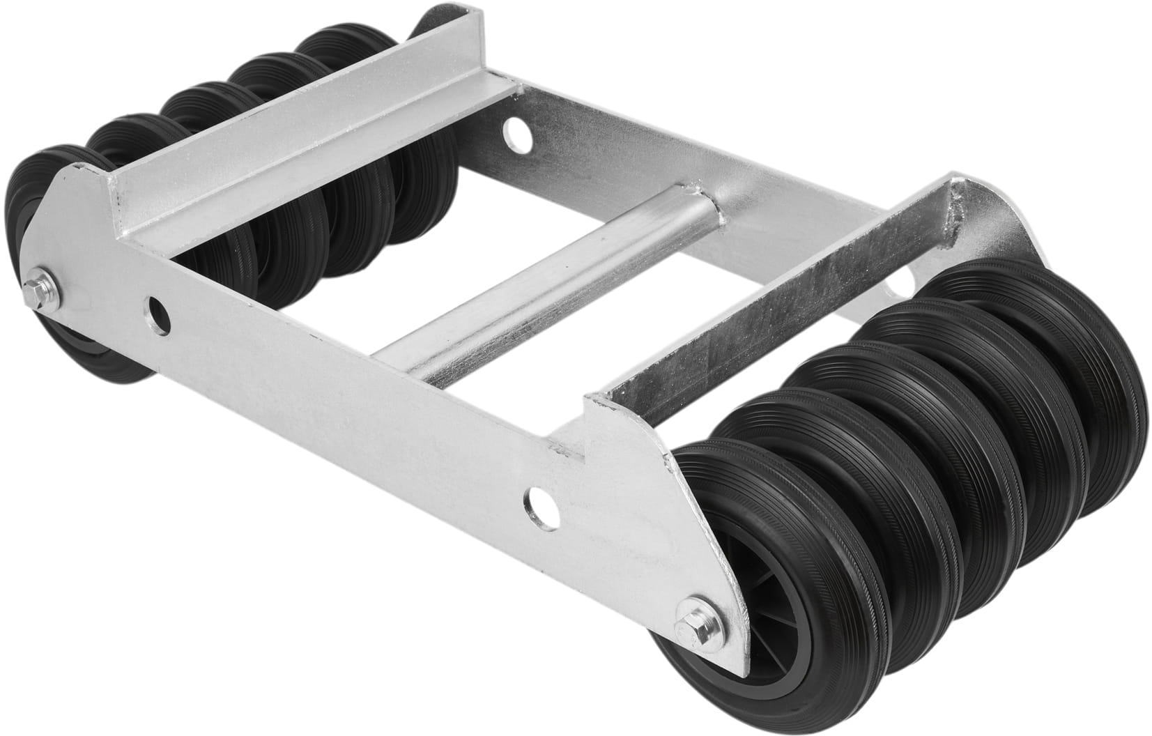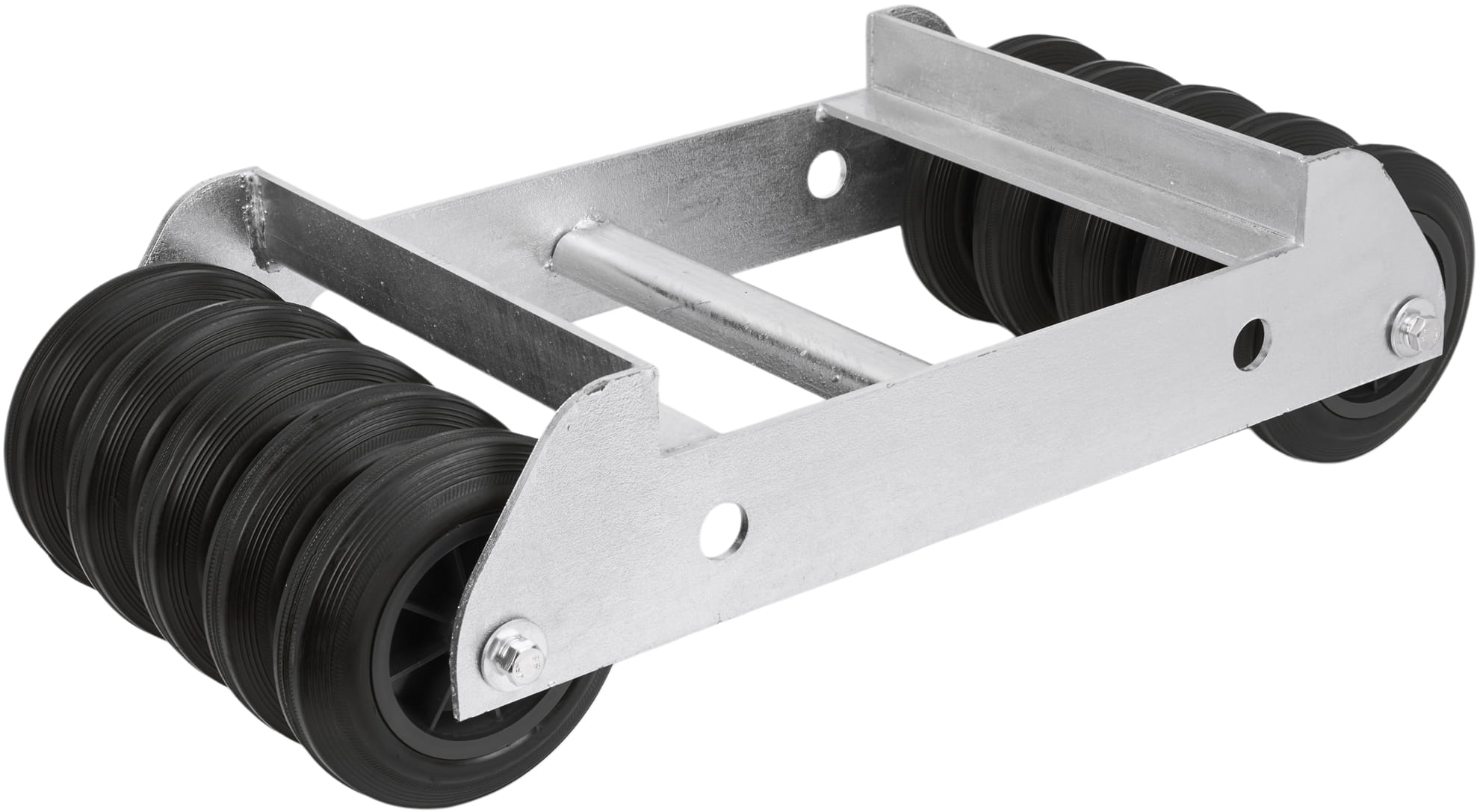Układ 10 kół (5 na każdą stronę ramy) równomiernie rozkłada obciążenie na podłoże i eliminuje punktowe naprężenia. Gumowa bieżnia amortyzuje nierówności nawierzchni i chroni posadzkę przed zarysowaniem, a poliamidowy rdzeń zachowuje sztywność pod dużym ciężarem.
