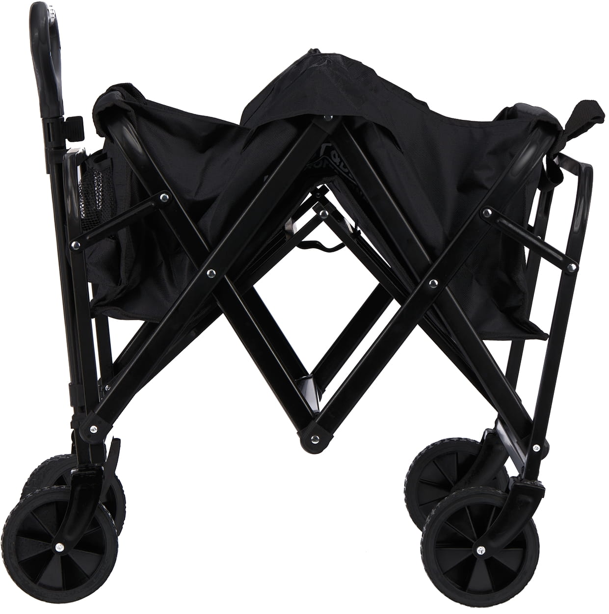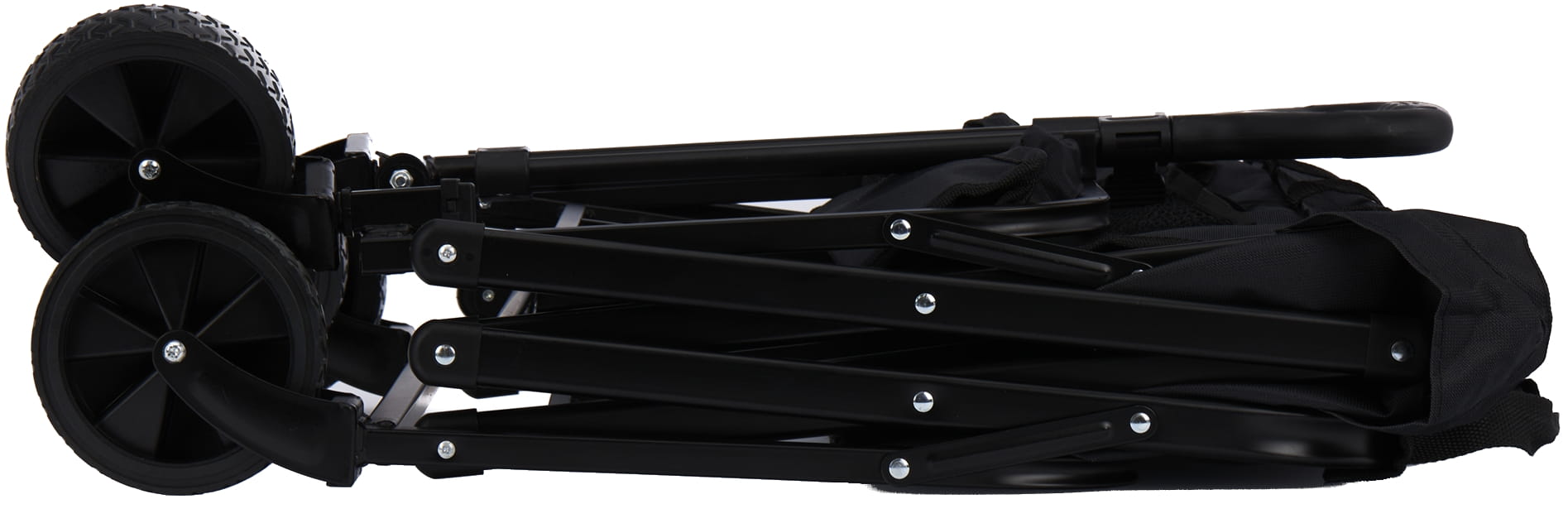 Wózek składa się w sposób umożliwiający kompaktowe przechowywanie — po złożeniu zajmuje znacznie mniej miejsca niż w pozycji roboczej. Dzięki temu nadaje się do transportu w bagażniku samochodu osobowego lub przechowywania w ograniczonej przestrzeni.