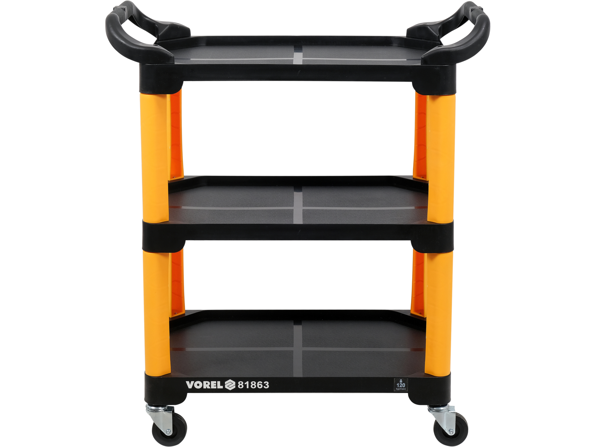 Wózek warsztatowy kompozytowy Vorel 81863 to niezastąpiony element wyposażenia każdego warsztatu, garażu czy magazynu. Jego trzy poziomy półek zapewniają wygodę w przechowywaniu i transporcie narzędzi oraz innych przedmiotów. Solidna konstrukcja z materiału PP gwarantuje długotrwałe użytkowanie, a średnica kółek 75 mm umożliwia łatwe manewrowanie nawet przy pełnym obciążeniu.