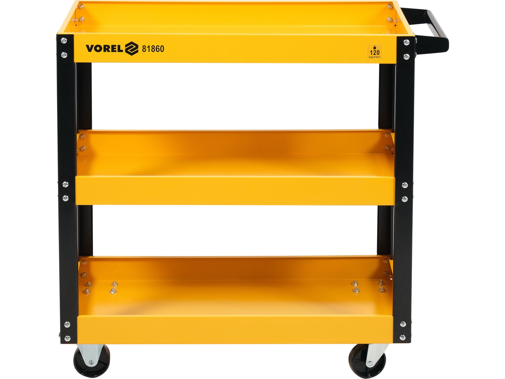 Mobilny wózek warsztatowy z trzypoziomową konstrukcją do przechowywania i transportu narzędzi. Wykonany z blachy stalowej z powłoką proszkową, wyposażony w 4 kółka dla łatwego przemieszczania w przestrzeni warsztatowej.