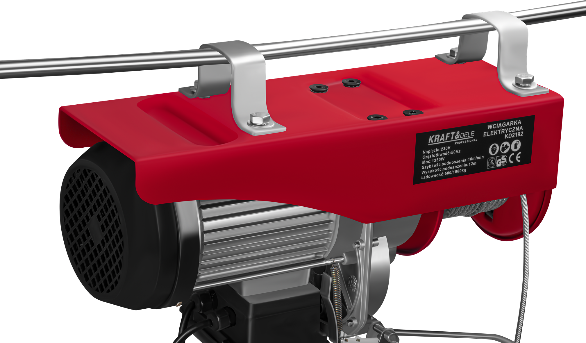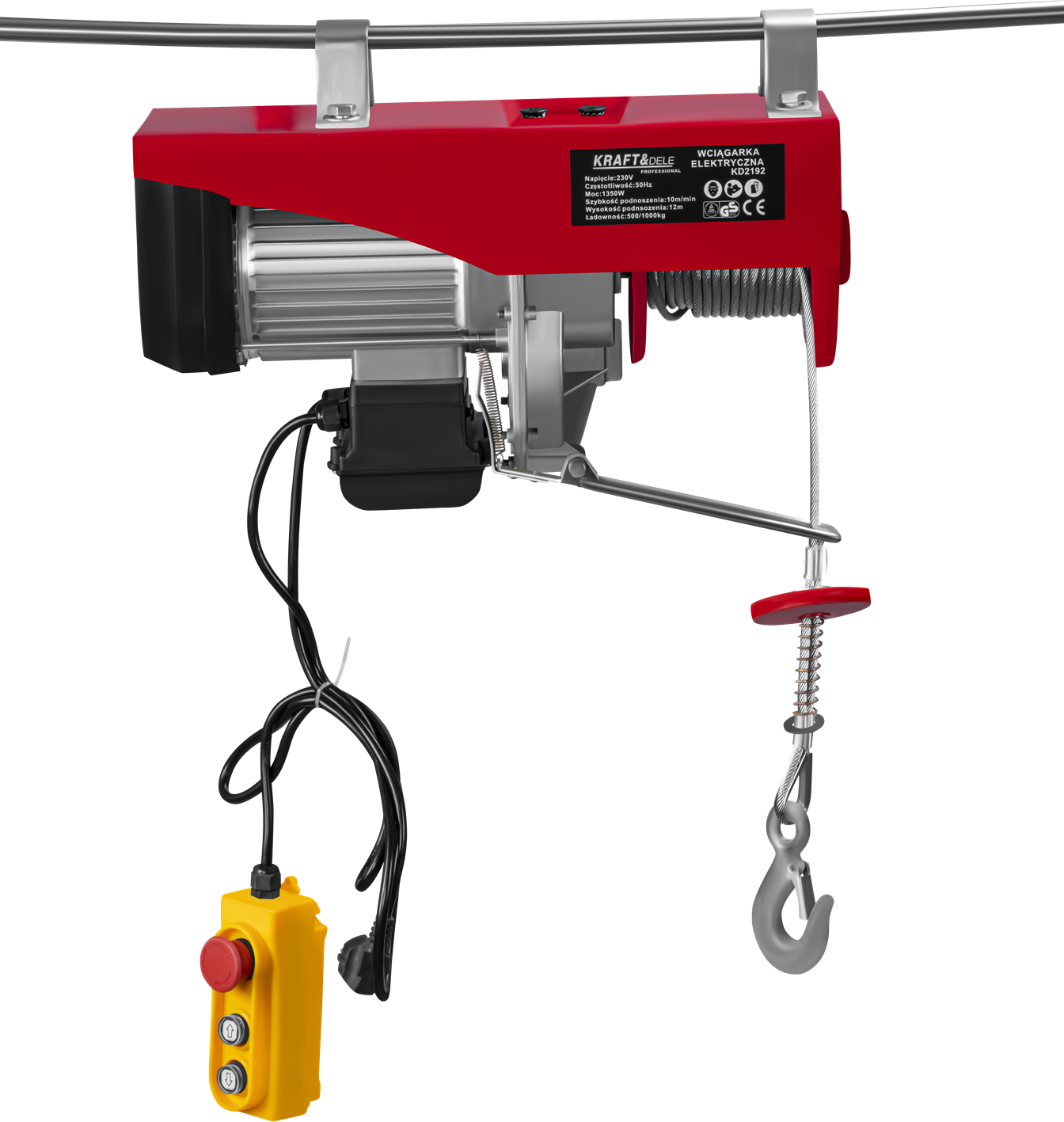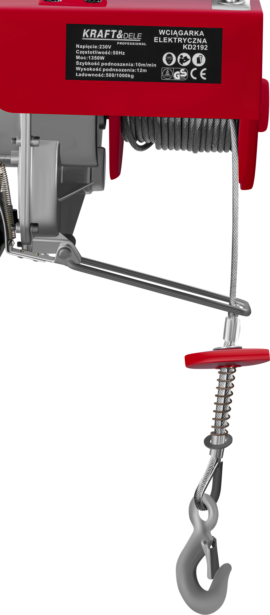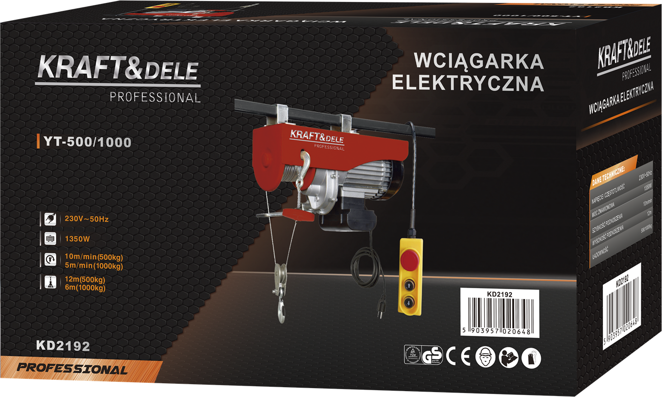 KD2192 to elektryczna wyciągarka linowa zasilana napięciem 230V, przeznaczona do podnoszenia i opuszczania ciężkich ładunków w warunkach warsztatowych, garażowych i budowlanych. Urządzenie pracuje w dwóch trybach udźwigu — z pojedynczym hakiem (500 kg) lub za pomocą zblocza z podwójnym hakiem (1000 kg) — przy wysokości podnoszenia do 12 metrów.