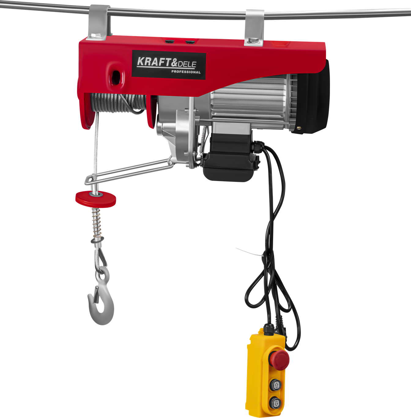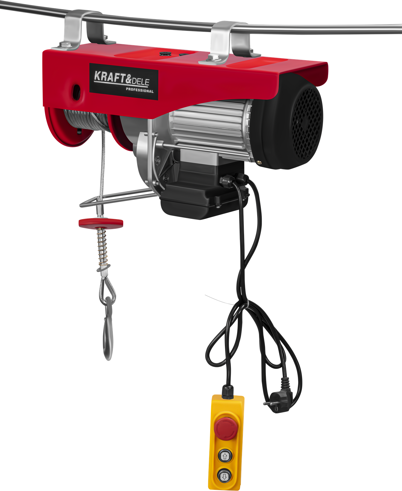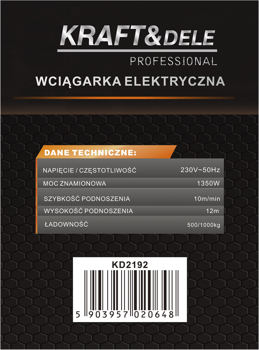 KD2192 to elektryczna wyciągarka linowa zasilana napięciem 230V, przeznaczona do podnoszenia i opuszczania ciężkich ładunków w warunkach warsztatowych, garażowych i budowlanych. Urządzenie pracuje w dwóch trybach udźwigu — z pojedynczym hakiem (500 kg) lub za pomocą zblocza z podwójnym hakiem (1000 kg) — przy wysokości podnoszenia do 12 metrów.