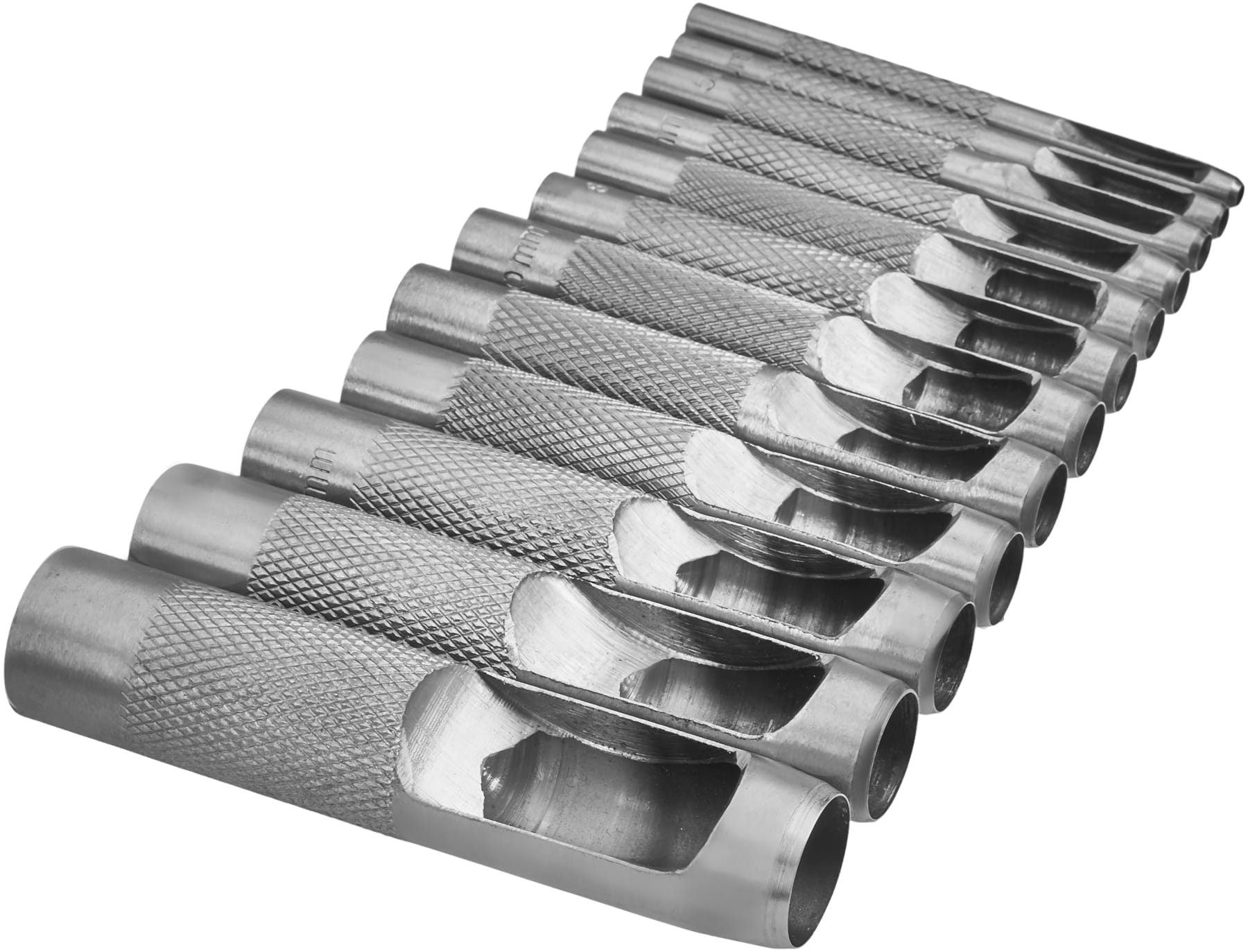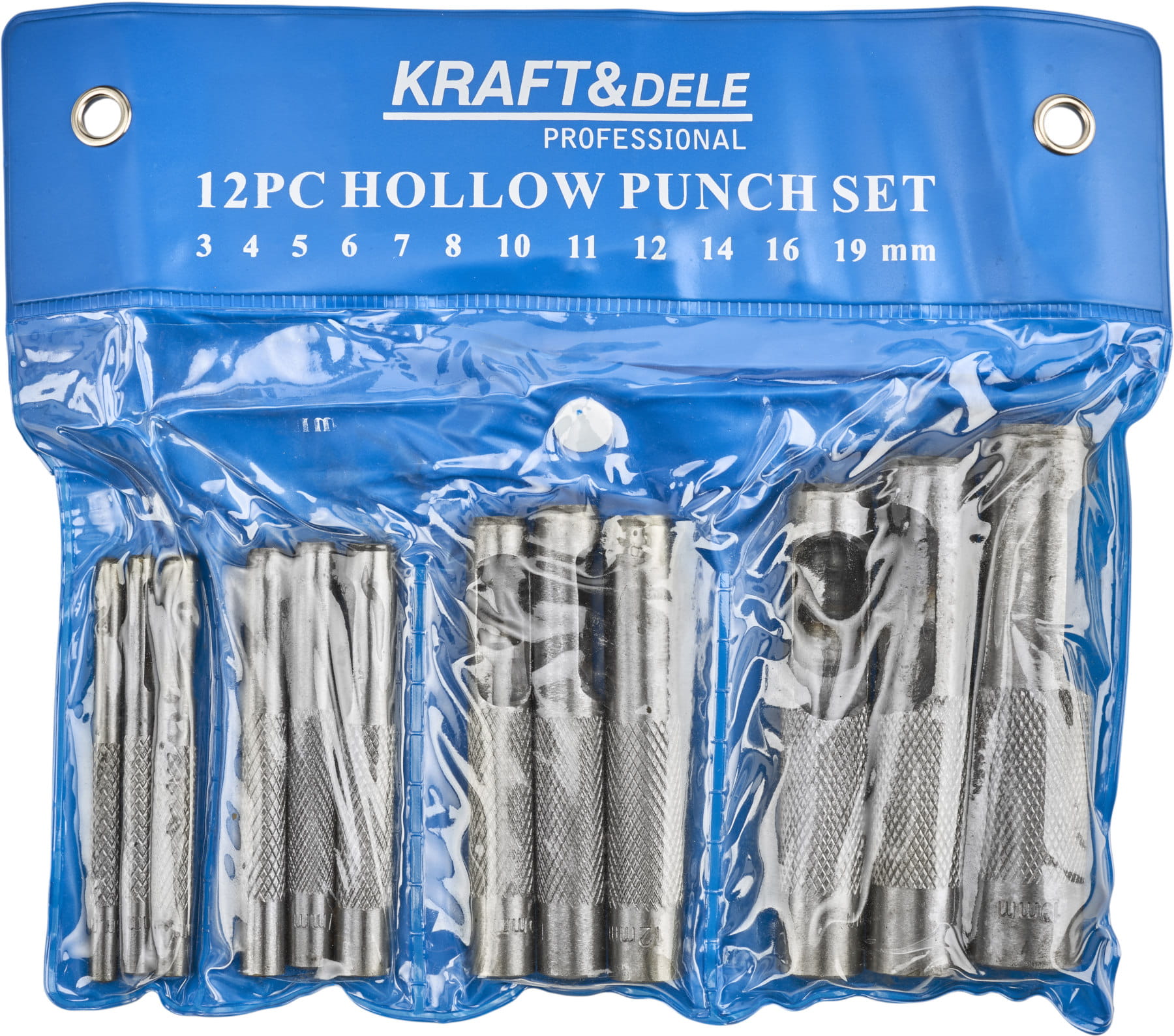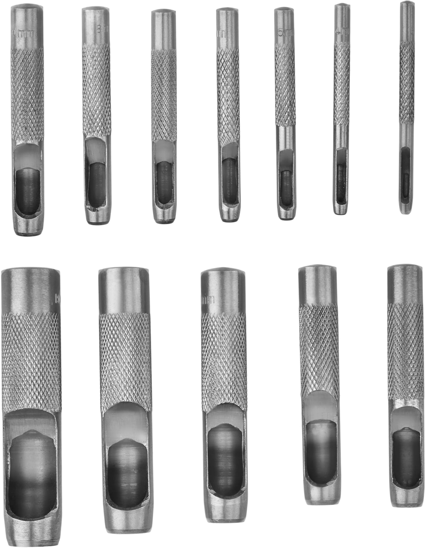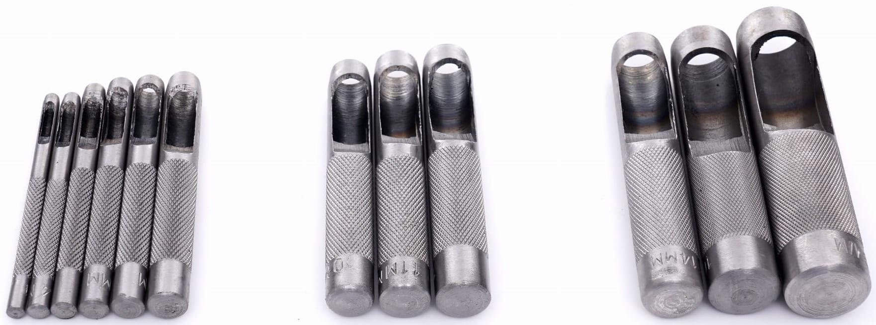 Zestaw zawiera wycinaki o średnicach: 3, 4, 5, 6, 7, 8, 10, 11, 12, 14, 16 i 19 mm. Dobór rozmiarów odpowiada najczęściej stosowanym wymiarom otworów w rymarстwie, tapicerstwie i pracach modelarskich — m.in. do pasków, zatyczek, przelotki i nitów.