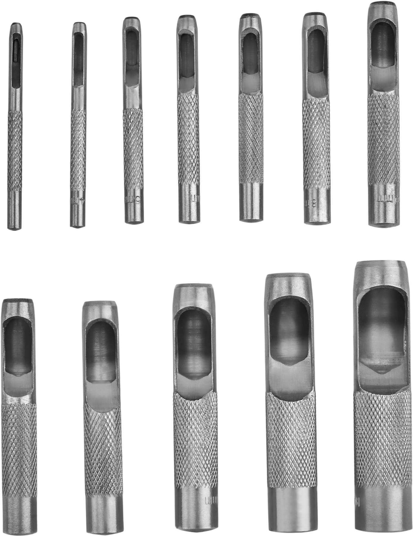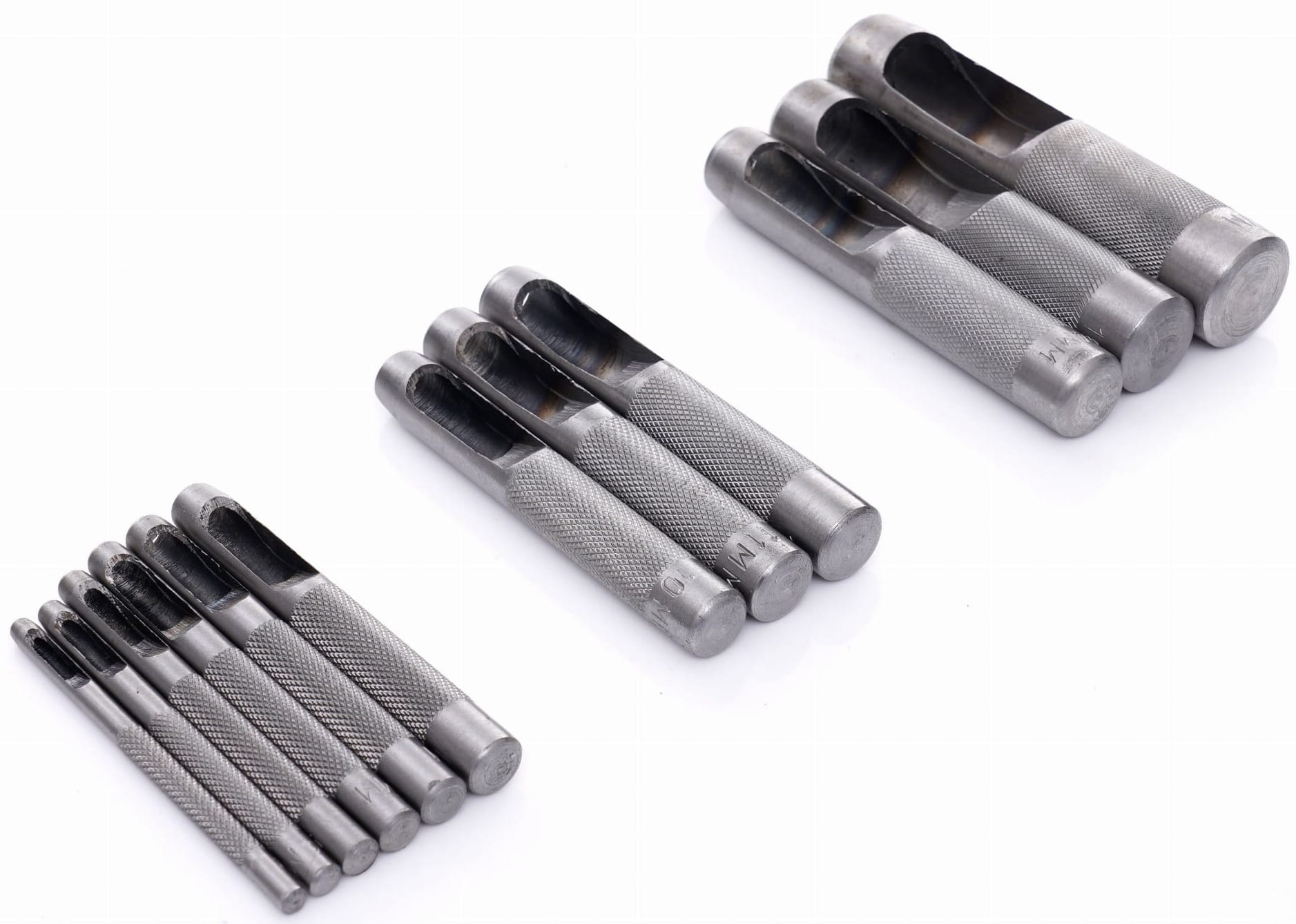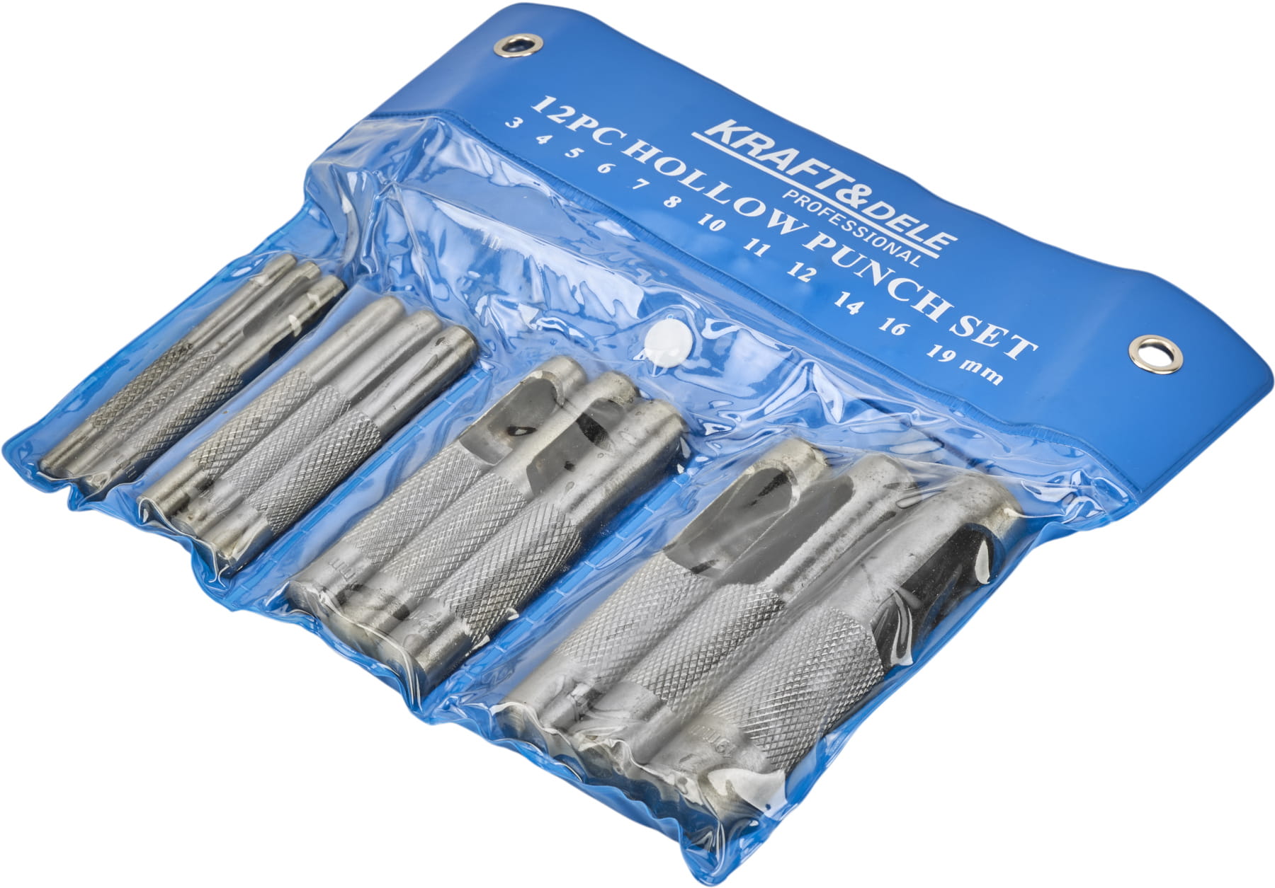 Zestaw zawiera wycinaki o średnicach: 3, 4, 5, 6, 7, 8, 10, 11, 12, 14, 16 i 19 mm. Dobór rozmiarów odpowiada najczęściej stosowanym wymiarom otworów w rymarстwie, tapicerstwie i pracach modelarskich — m.in. do pasków, zatyczek, przelotki i nitów.