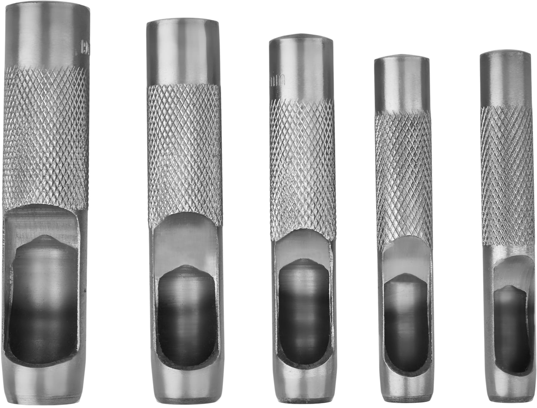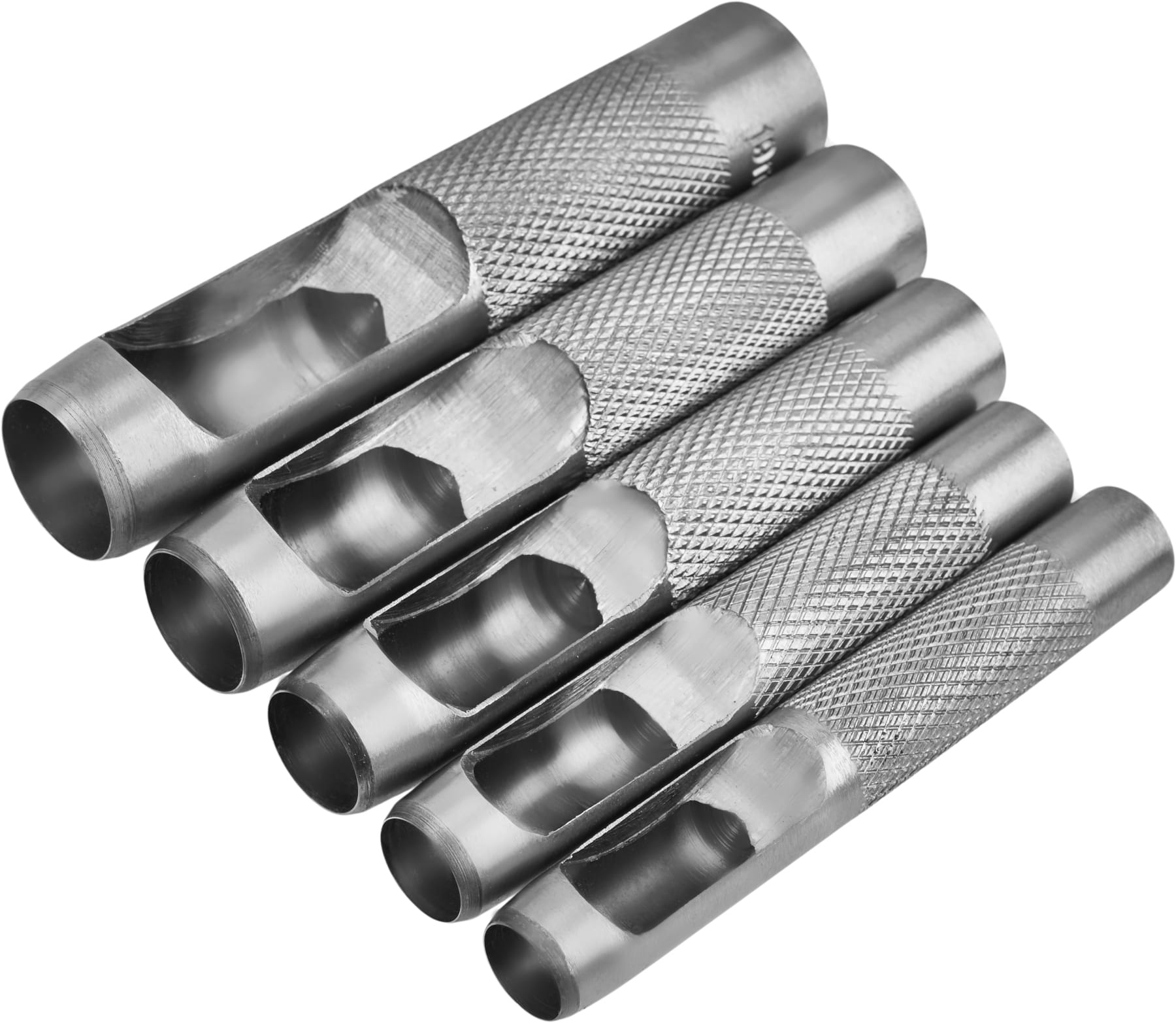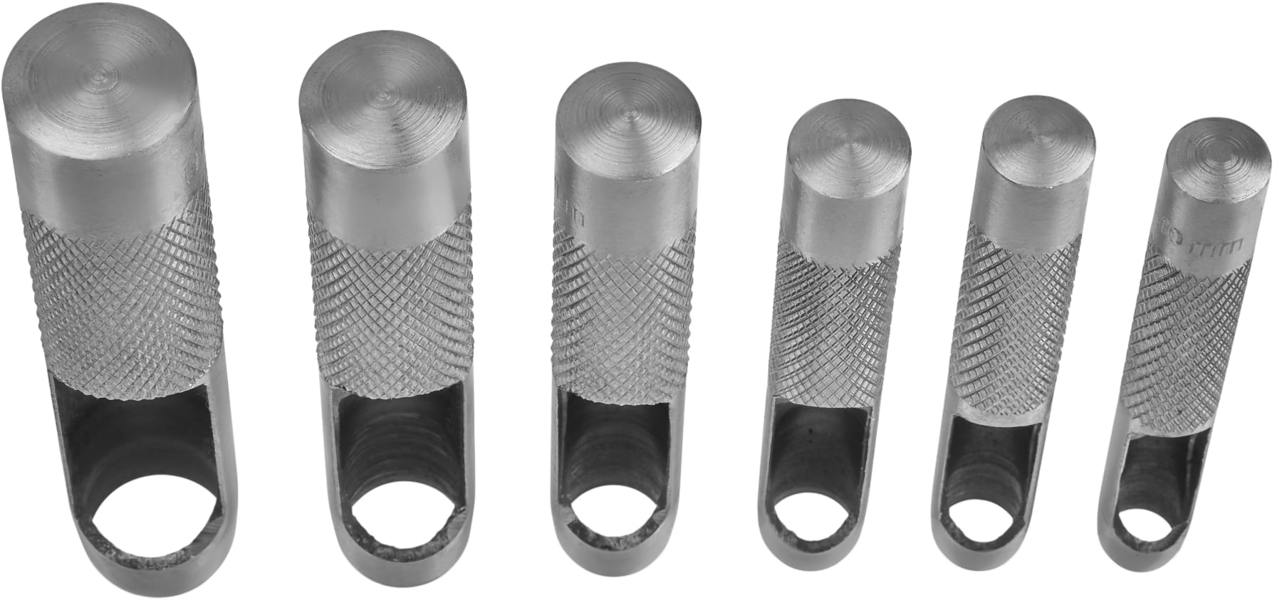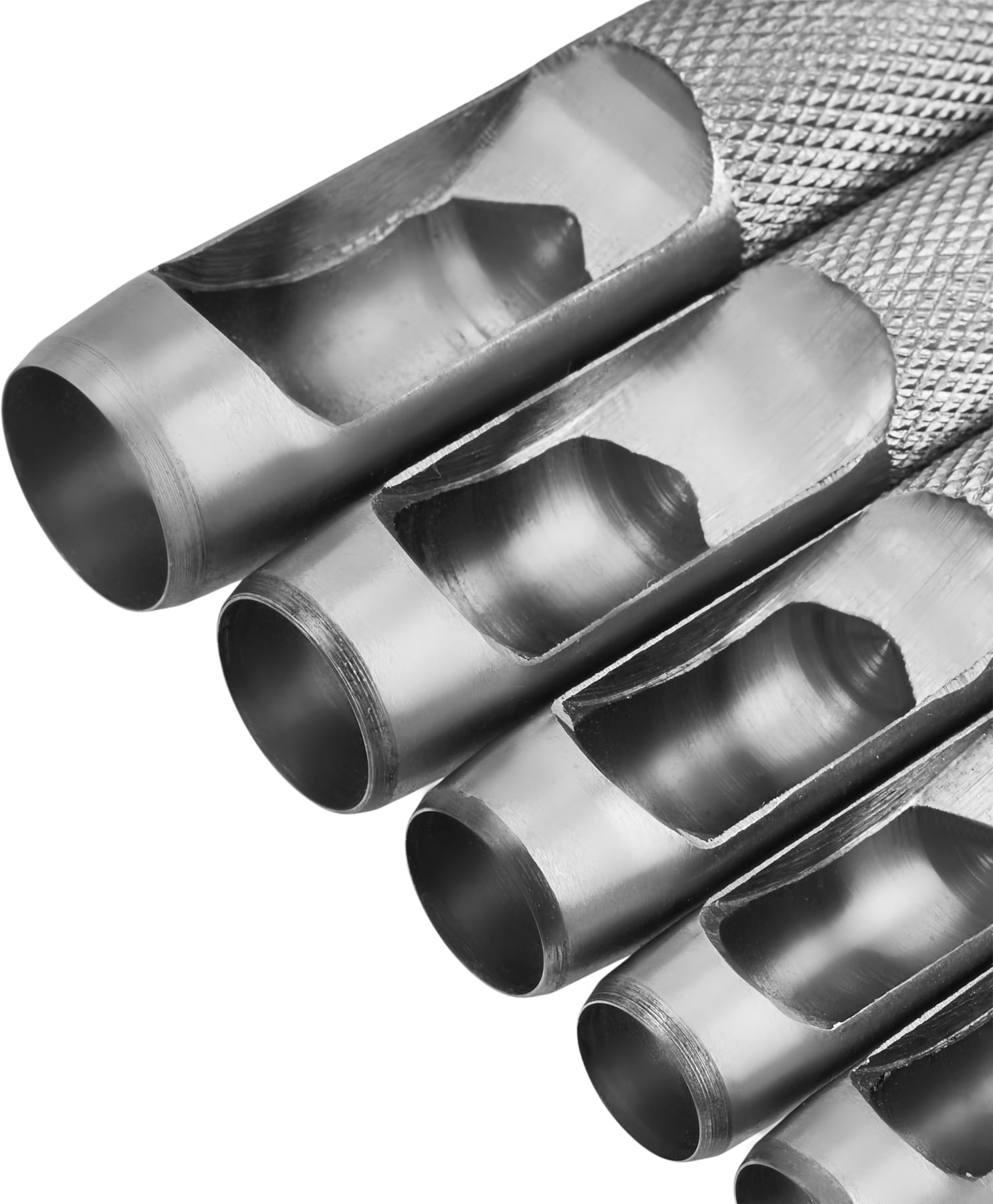 Zestaw zawiera wycinaki o średnicach: 3, 4, 5, 6, 7, 8, 10, 11, 12, 14, 16 i 19 mm. Dobór rozmiarów odpowiada najczęściej stosowanym wymiarom otworów w rymarстwie, tapicerstwie i pracach modelarskich — m.in. do pasków, zatyczek, przelotki i nitów.