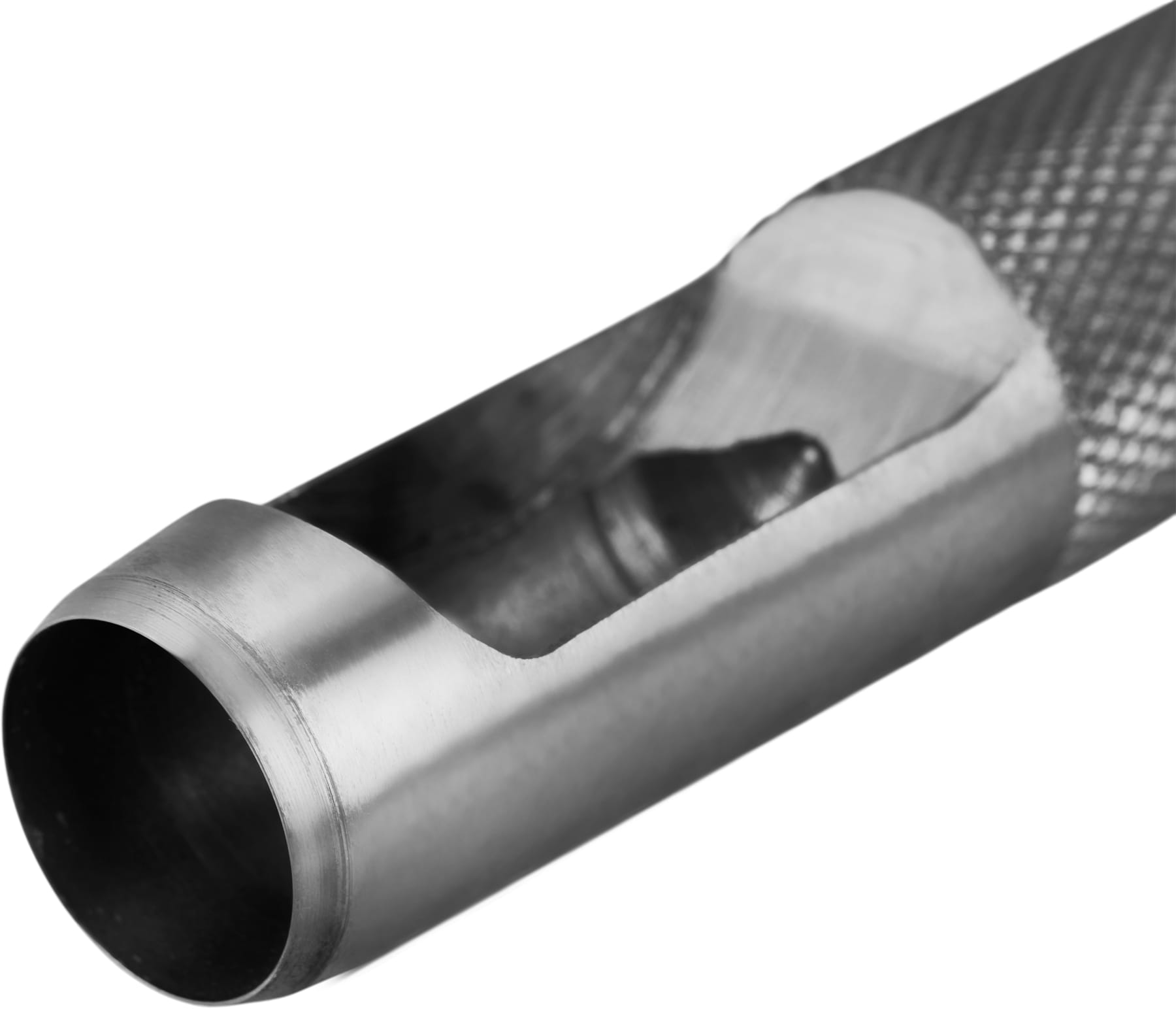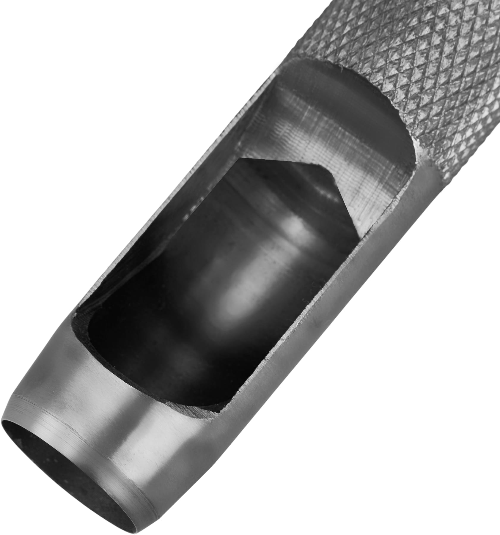 Rowkowanie na powierzchni uchwytu (radełkowanie) zwiększa tarcie między dłonią a narzędziem. Dzięki temu wycinak nie obraca się w ręce podczas uderzenia młotkiem, co ma bezpośredni wpływ na precyzję wycinanego otworu i bezpieczeństwo pracy.