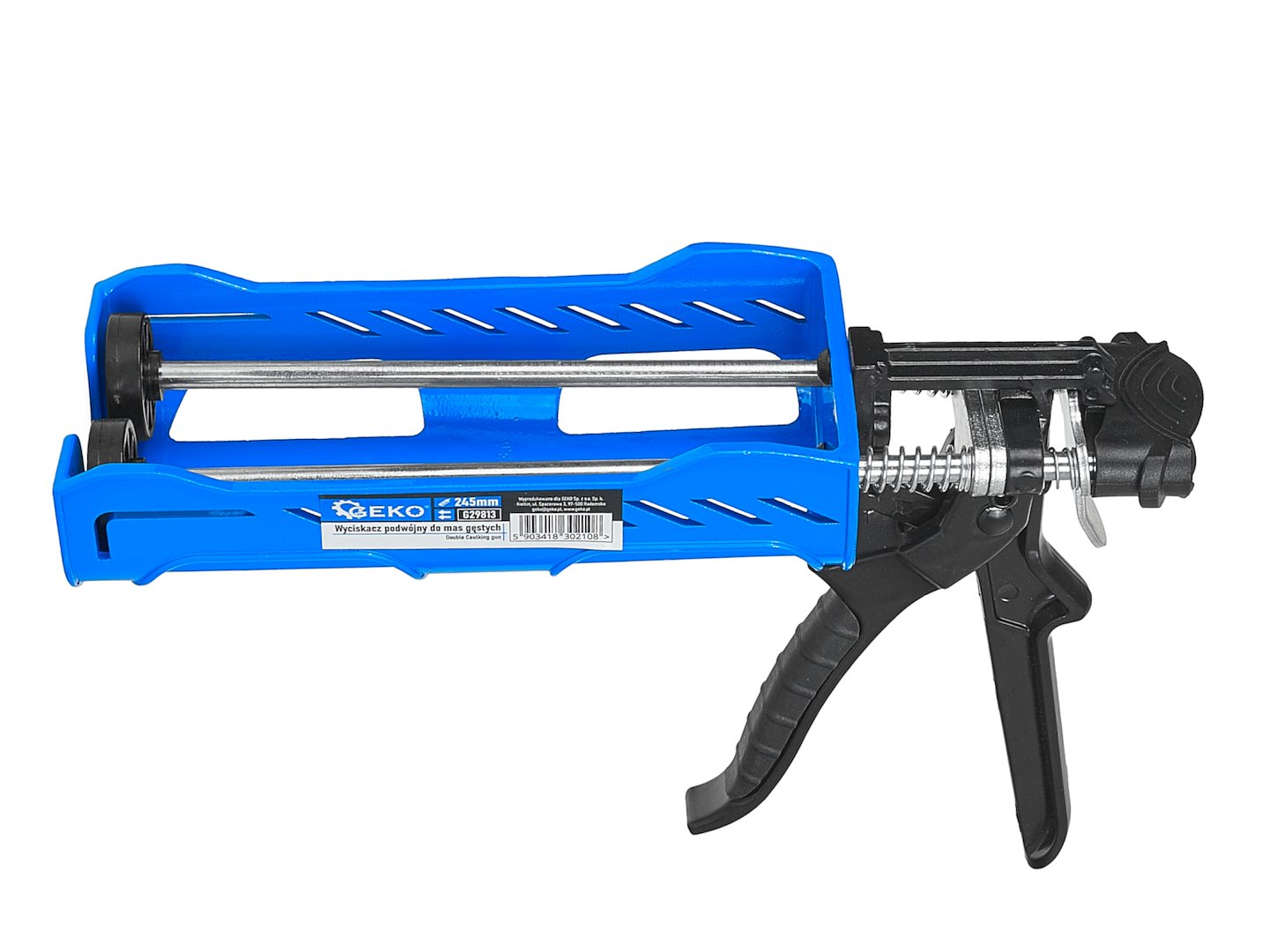 Wyciskacz podwójny przeznaczony do dozowania materiałów o wysokiej lepkości z tub dwuskładnikowych o długości do 245 mm. Mechanizm zapadkowy z podwójnym układem popychaczy zapewnia równomierny nacisk na oba tłoki tuby jednocześnie, co ma kluczowe znaczenie przy pracy z klejami dwuskładnikowymi i masami chemicznymi wymagającymi precyzyjnych proporcji mieszania.